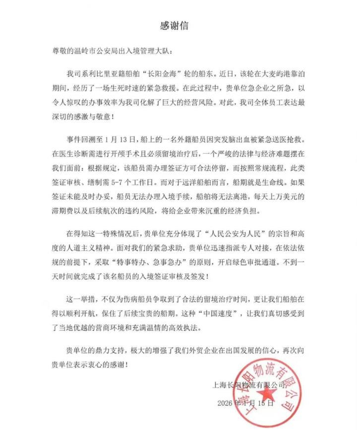 1月15日,台州。温岭出入境管理大队收到了一封情真意切的感谢信:“在紧急关头,贵单位急企业之所急以高效专业的服务为我们化解了重大经营风险……这种‘中国速度’让我们深切感受到优越的营商环境和有温度的执法服务”。