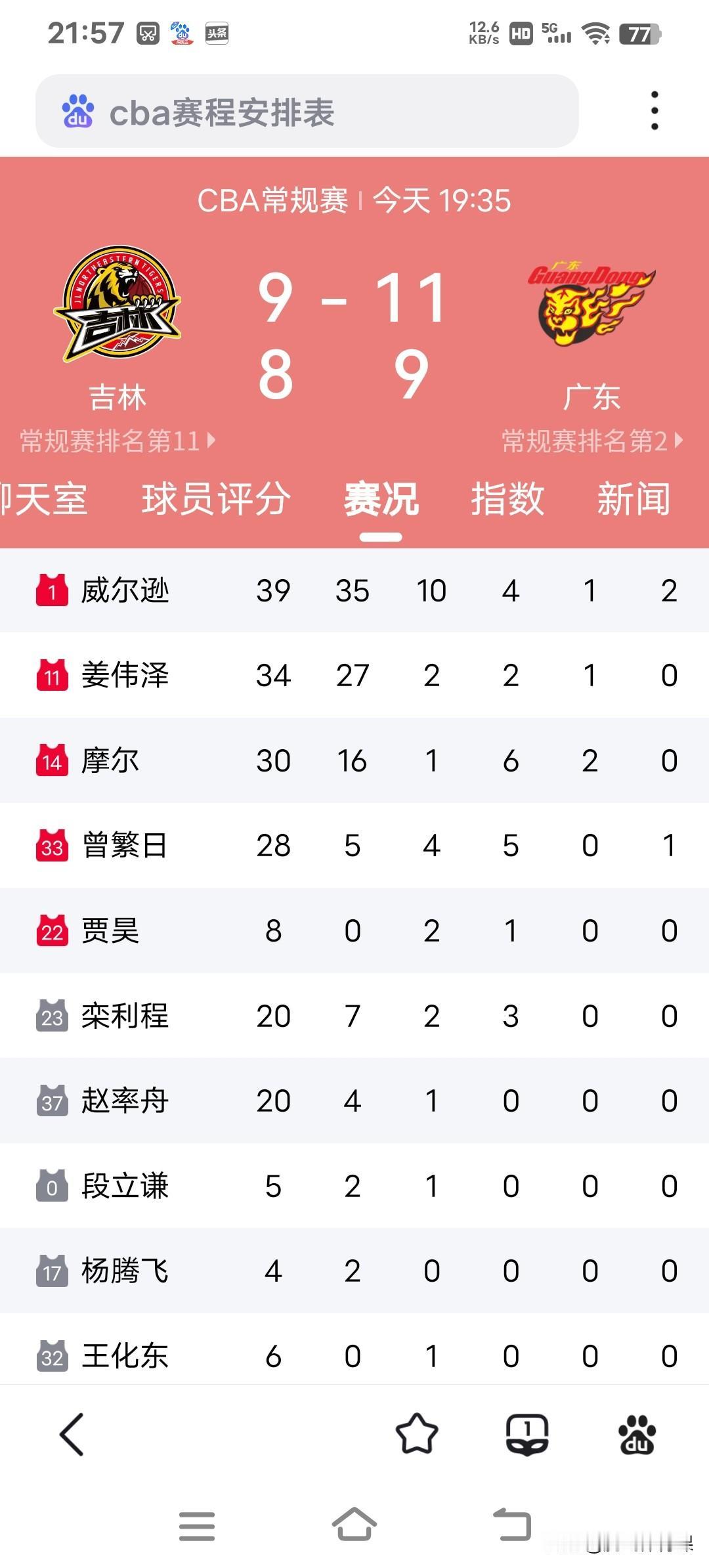 姜伟泽:广东队一直是联盟的豪门球队,冲冠概率很大。 CBA常规赛第十八轮,吉林主场98:119不敌广东,赛后吉林队姜伟泽这样点评比赛:广东队一直是联盟的豪门球队,我们虽然输了球,但是我们仍不因输球而失去信心,毕竟目前广东队的配置整体实力强大,各个位置人才济济,冲冠的概率非常大,真的非常羡慕广东队的阵容搭配。 姜伟泽 全场出战34分钟,全场18投10中,其中三分球9投5中,全场贡献27分2篮板2次助攻1次抢断,表现相当全面,数据上赢了徐杰,无奈球队却输球。