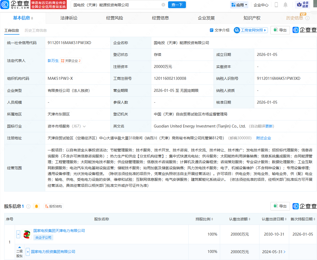 企查查APP显示,近日,国电投(天津)能源投资有限公司成立,法定代表人为彭万生,注册资本为2亿元,经营范围包含:以自有资金从事投资活动;节能管理服务;储能技术服务;站用加氢及储氢设施销售等。企查查股权穿透显示,该公司由国家电力投资集团有限公司间接全资持股。