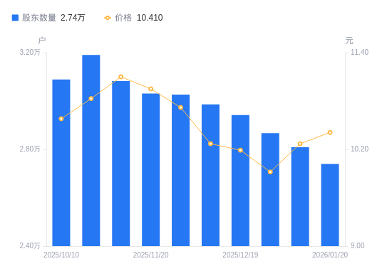 日期A股户数(户)流通A股户均持股数(股)户均持股市值(万元)2026-01-20273978711.499.072026-01-09280878497.488.732025-12-31286728324.118.262025-12-19294178113.308.272025-12-10298637992.128.212025-11-28302637886.498.452025-11-20303117874.008.622025-11-10308207743.968.602025-10-20319057480.618.102025-10-10308917726.168.17