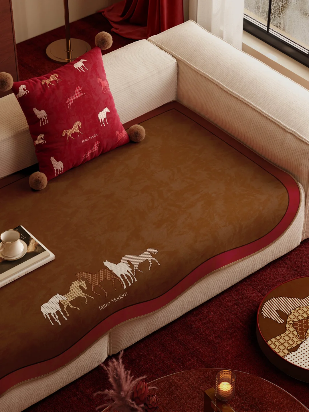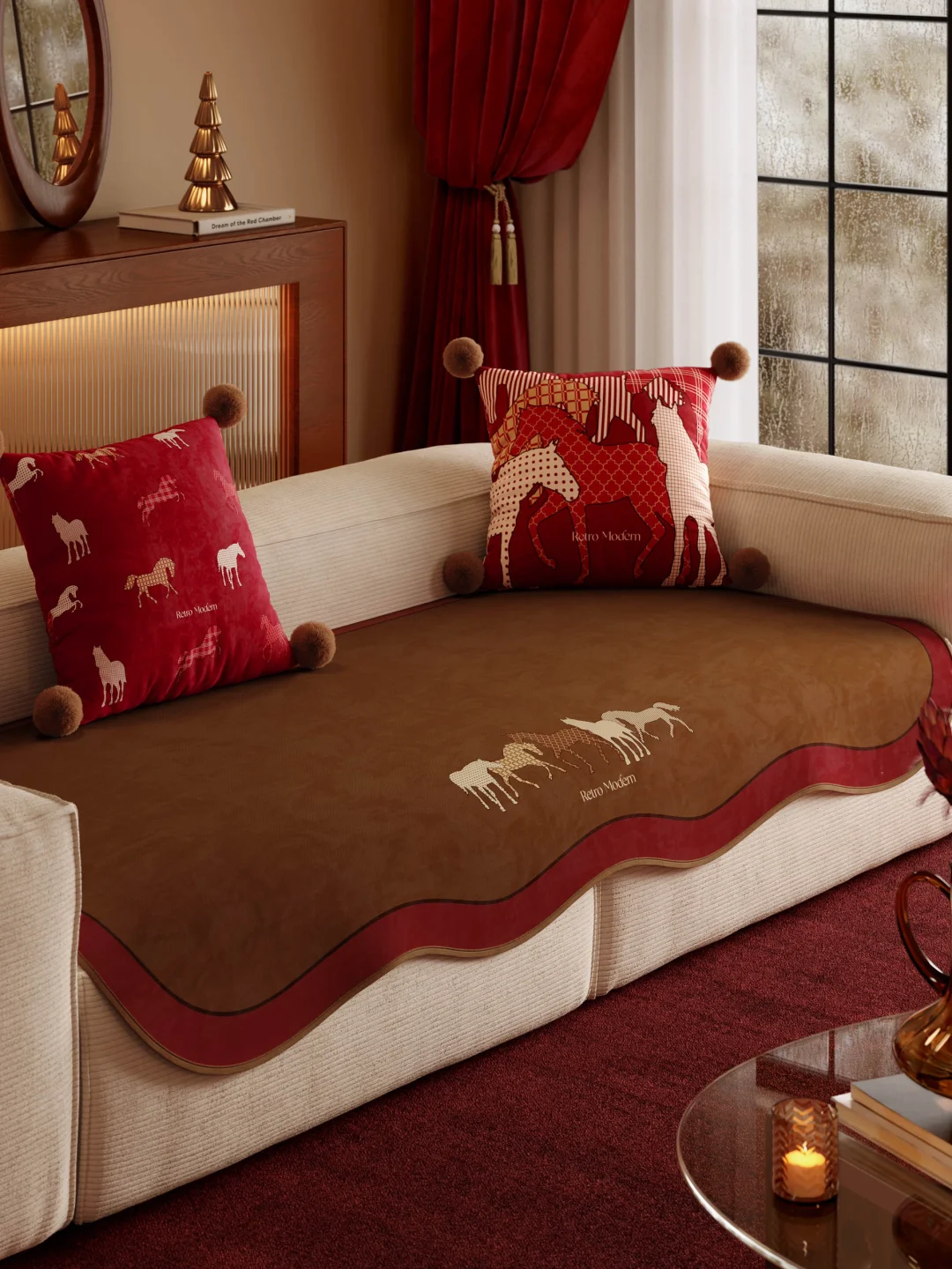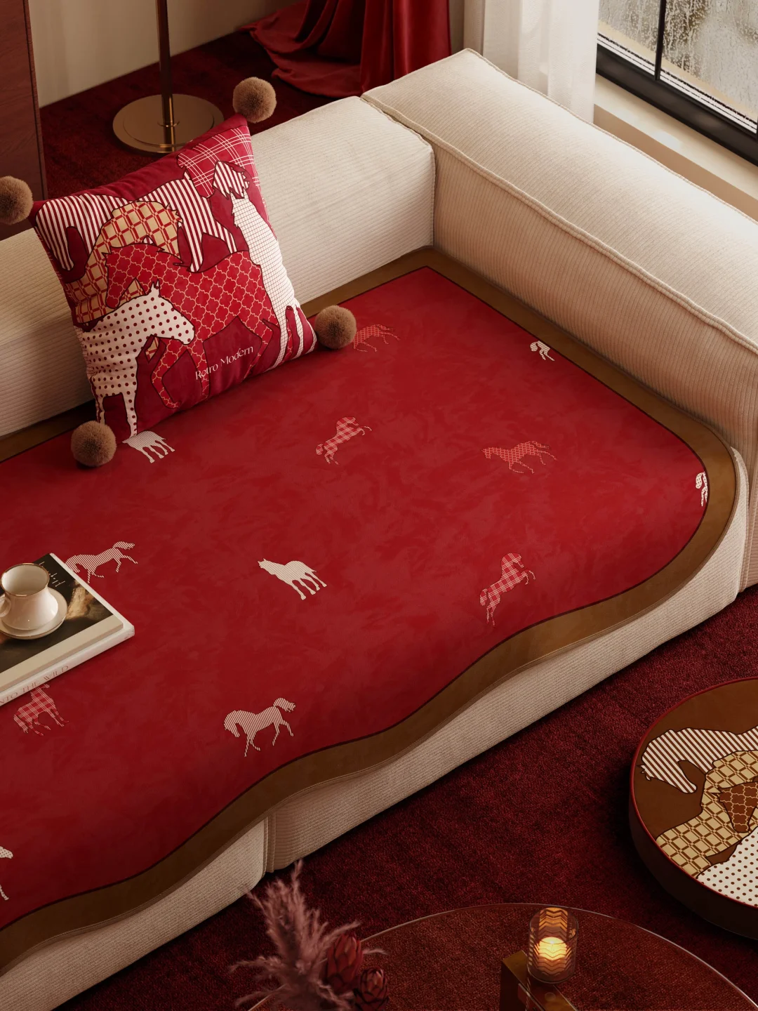 复古绒红铺展暖意 小马驹错落跃动 把新年的期许与马年的巧思都晕进织物里 - 软绒亲肤裹住冬日慵懒 波浪棕边缀着俏皮毛球 松弛感与年味儿在此刻恰好平衡 - 无需繁复布置,一套就位 客厅便成了藏着仪式感的潮流角落