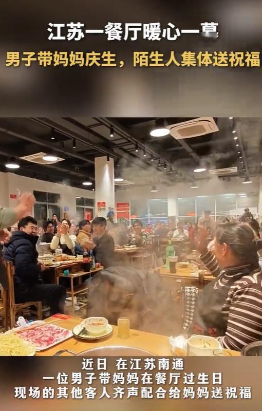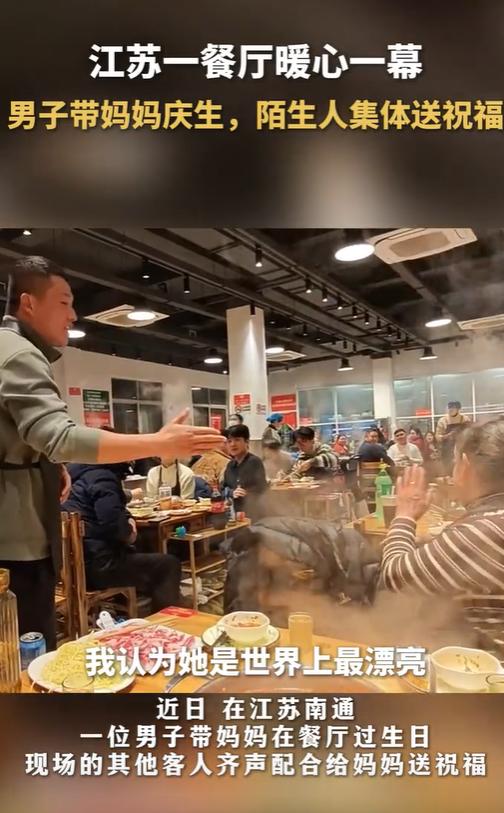 “上人民日报了!”江苏南通,一男子带妈妈到火锅店过生日,吃着吃着,男子突然站起来,对大厅内正在就餐的客人提出一个大胆请求,接下来一幕令人泪目! 当天这位男士特意带着母亲来到火锅店,想热热闹闹给妈妈过个生日,恰逢用餐高峰店里座无虚席,每张桌子都围着食客,沸腾的锅底冒着热气,大家要么埋头享用美食,要么和同行的人轻声交谈,整个大厅满是烟火气与喧闹声,一开始这对母子就和其他食客一样,安静地吃着饭,没人留意到他们,谁也想不到接下来会有一场暖心互动。 饭吃到一半,男子突然放下筷子站起身,朝着喧闹的大厅抬手示意,等周围稍微安静一些后,他才开口说话,语气带着几分忐忑,却又格外坚定。 他没有多余的铺垫,直接向在场所有人说明,当天是自己母亲的寿辰,还温柔地夸赞母亲是世上最美丽、最温柔也最贤惠的人,话音刚落他便说出了那个大胆请求,希望等自己喊出“妈妈”的时候,在场的各位能帮忙一起喊一句“生日快乐”。 向一屋子素不相识的陌生人“众筹”祝福,这事儿说起来容易,做起来却需要很大勇气,毕竟谁也不确定大家会不会配合,会不会觉得被打扰而面露不悦,可让人意外的是,现场没有丝毫冷场,也没有迟疑,在男子说完请求后,全场食客几乎异口同声地回应表示可以,语气里满是善意与包容。 得到肯定答复的男子,深吸了一口气,压下心头的情绪,用尽全力朝着身边的母亲喊出了一声“妈妈——”,刹那间整个火锅店仿佛被按下了统一开关,所有食客都停下手中的动作,整齐划一地高声呼喊“生日快乐”,洪亮又真挚的祝福声,瞬间盖过了锅底的沸腾声,响彻整个大厅,场面格外震撼。 更让人动容的是,男子没有只喊一次,而是连着喊了三遍“妈妈”,每一次话音落下,现场的客人们都极具默契地跟着高呼“生日快乐”,一遍比一遍响亮,声浪层层叠加,把现场的氛围推向了顶点。 身旁的母亲看着这一幕,脸上早已笑开了花,眼角却忍不住泛起泪光,双手或许是激动,或许是幸福,微微有些颤抖,那一刻,她无疑是整个店里最受宠、最幸福的人。 有人把这温馨的一幕拍了下来,视频上传到网络后,迅速掀起热潮,热度一路飙升,最后还被人民日报转发报道,让全国网友都感受到了这份跨越陌生的温情,评论区里不少人被这份简单却真挚的祝福打动,纷纷留言感慨。 有网友说这才是真正的顶配生日,不需要花大价钱订豪华包厢,不用搞铺张浪费的排场,仅凭一颗对母亲的赤诚真心,就胜过所有昂贵的礼物。也有人留言,人到中年还能毫无顾忌地喊一声“妈妈”,还能陪在母亲身边过生日,本身就是一种千金不换的福气。 还有一位网友带着遗憾写道,自己的妈妈已经去世16年,这声“妈妈”,自己已经16年没机会喊出口了,字里行间满是思念。 其实细细想来这位儿子的做法,高明之处就在于那份纯粹。他没有追求物质上的奢华,而是用最质朴的方式,让母亲真切感受到被全世界偏爱的温暖,那些素不相识的食客,成了母亲寿辰最特别的见证人,这份独一无二的仪式感,是任何金钱都买不到的。 同样让人感动的,还有现场的每一位陌生人,他们没有因为用餐被打断而烦躁,也没有选择冷眼旁观,而是毫不犹豫地伸出善意之手,用一句简单的祝福,为一位陌生母亲的生日增添了温暖。 这恰恰是刻在国人骨子里的温良,只要看到他人有真诚的需求,便愿意停下手中的事,赠予一份暖心的善意,“妈妈”二字,从来都是世间最温柔的代名词,有妈妈在就有永远的避风港,哪里都是家,可若是妈妈不在了,所谓的家,便只剩一个遥远的归期,我们总以为来日方长,却忘了时光易老,母亲的白发只会越来越多,陪伴的日子只会越来越少。