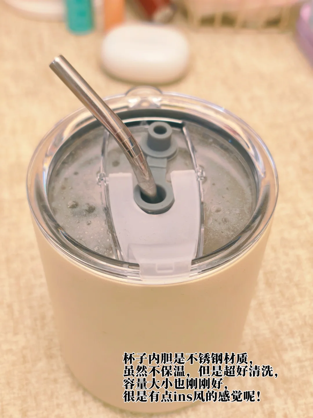 这个杯子算是在我的一众“杯妃”里面最朴素的一个啦!乳白色的磨砂面真的超有质感,杯子内胆是不锈钢材质,虽然不保温,但是超好清洗,容量大小也刚刚好,很是有点ins风的感觉呢!