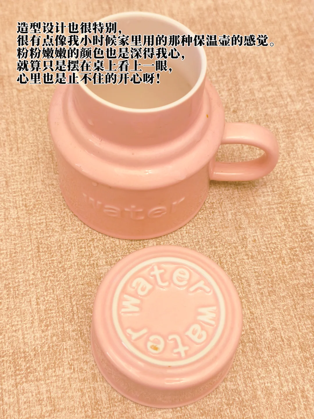 这个杯子是我在网上第一眼看到它的时候就立马拿下的一款!陶瓷的质地,拿到手上超有分量!造型设计也很特别,很有点像我小时候家里用的那种保温壶的感觉。粉粉嫩嫩的颜色也是深得我心,就算只是摆在桌上看上一眼,心里也是止不住的开心呀!