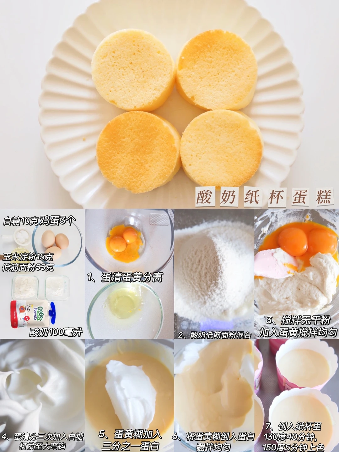 制作:蛋黄蛋清分离,酸奶加入面粉翻拌均匀,再加入蛋黄搅拌均匀,蛋清滴几滴柠檬汁,分三次加入白糖打发至大弯钩,蛋黄糊加入三分之一蛋白搅拌均匀,快速倒入蛋白翻拌均匀,倒入纸杯八分满,130度40分钟,150度5分钟上色即可