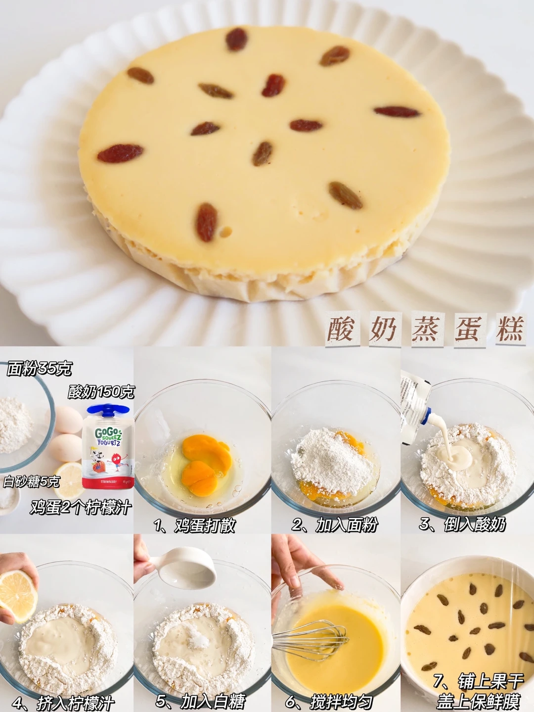 制作:鸡蛋打入碗中,加入面粉,倒入酸奶➕几滴柠檬汁➕白糖,搅拌均匀,模具铺上油纸,倒入蛋糊,放入葡萄干,上锅蒸20分钟即可