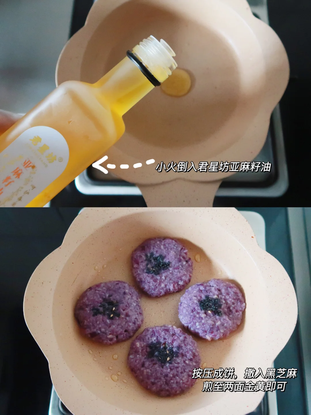 图4⃣️:按压成饼状,撒上黑芝麻,小火倒入油,煎至两面金黄色即可