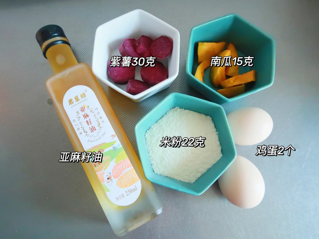 图2⃣️:准备的所有材料:米粉23克,鸡蛋两个,紫薯30克,南瓜15克,黑芝麻,亚麻籽油