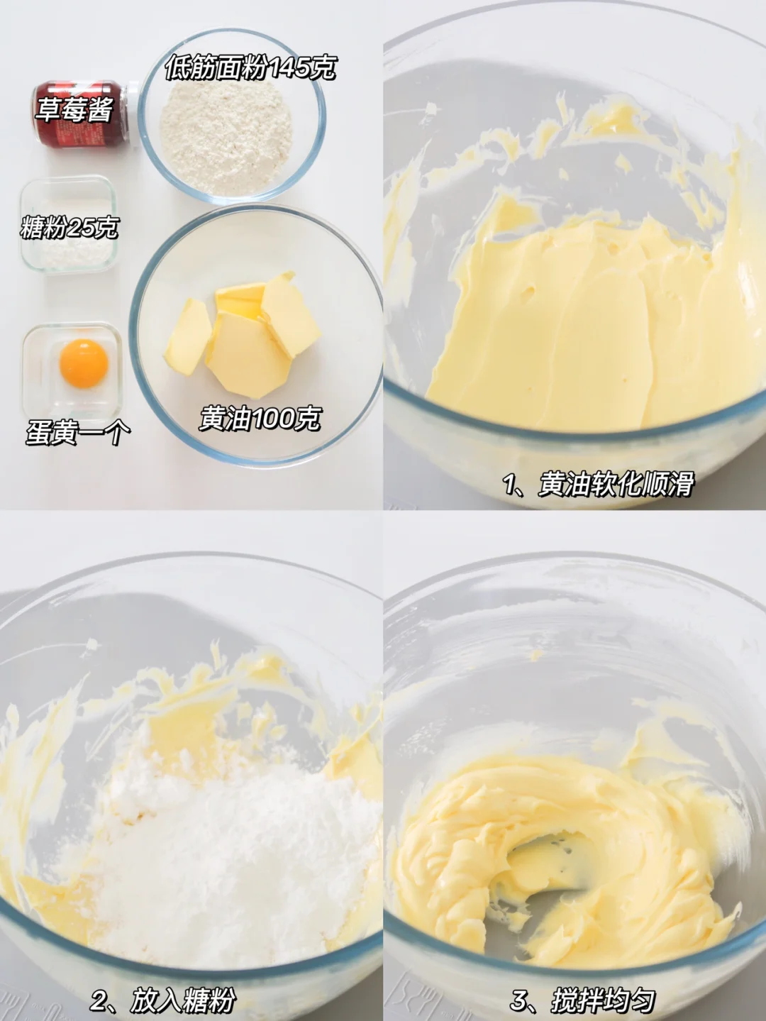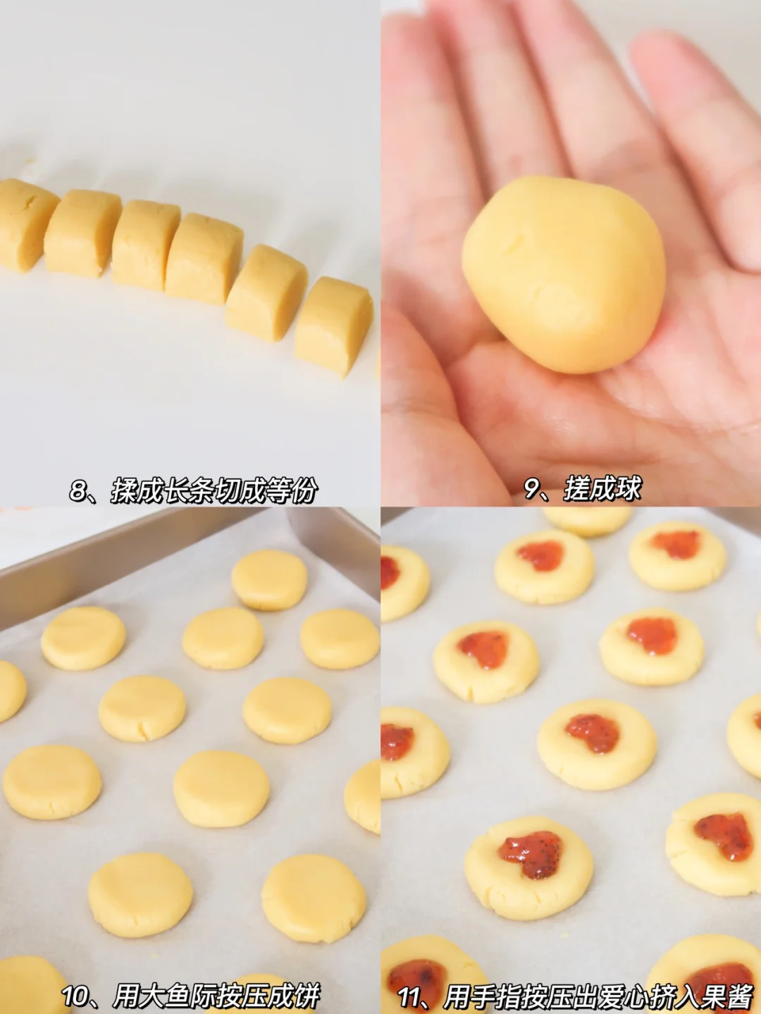 过两天就到七夕了,大家一定要给另一半安排呀,每一个指纹都是独一无二的,而且好简单,酥到掉渣!大家可以放自己爱吃的果酱,小盆友也可以放果泥都是可以的哦!赶紧安排吧! 食材: 黄油100克 面粉145克 糖粉25克 蛋黄1个 果酱少许 制作: 1、黄油软化用刮刀拌匀润滑,放入糖粉搅拌融合 2、放入蛋黄搅拌至有点发白,再筛入低筋面粉拌匀成面团 3、面团擀成长条,然后切成小剂子,然后搓成小球,用大鱼际按压成小饼,然后用手指交叉按压成心形,最后挤入果酱 4、放入烤箱160度20分钟中层即可