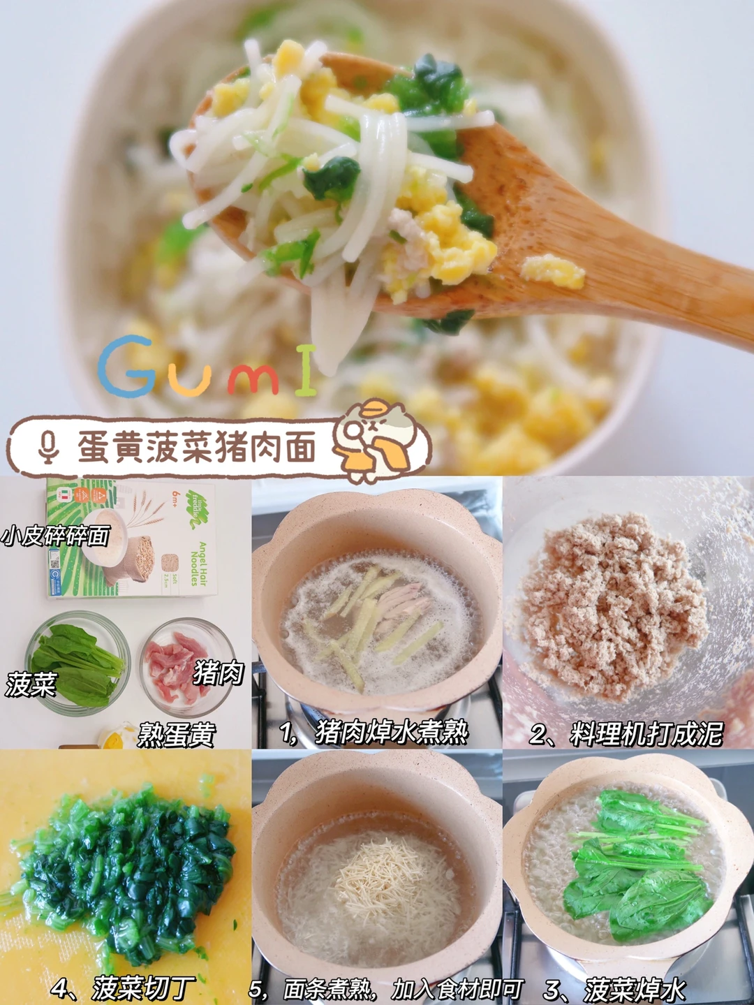 食材:小皮面条,菠菜,猪肉,熟蛋黄