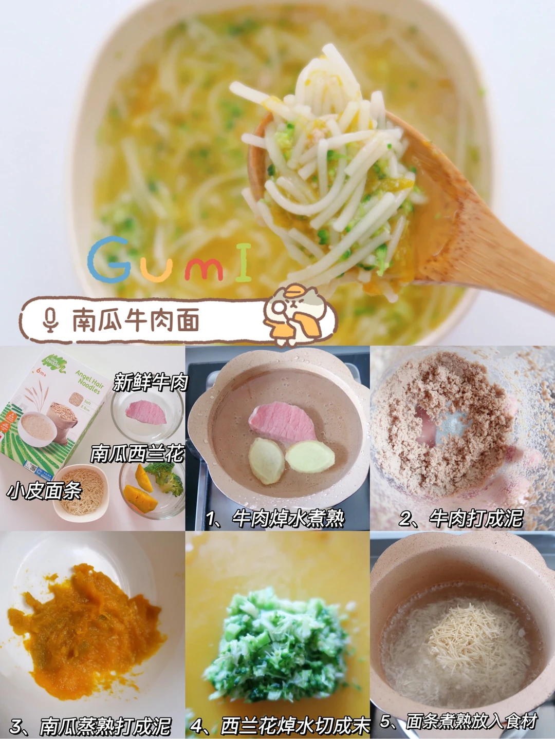 制作过程:牛肉去腥后焯水煮熟打成泥,南瓜蒸熟捣成泥,西兰花焯水切成末,面条煮熟后放入所有菜拌匀