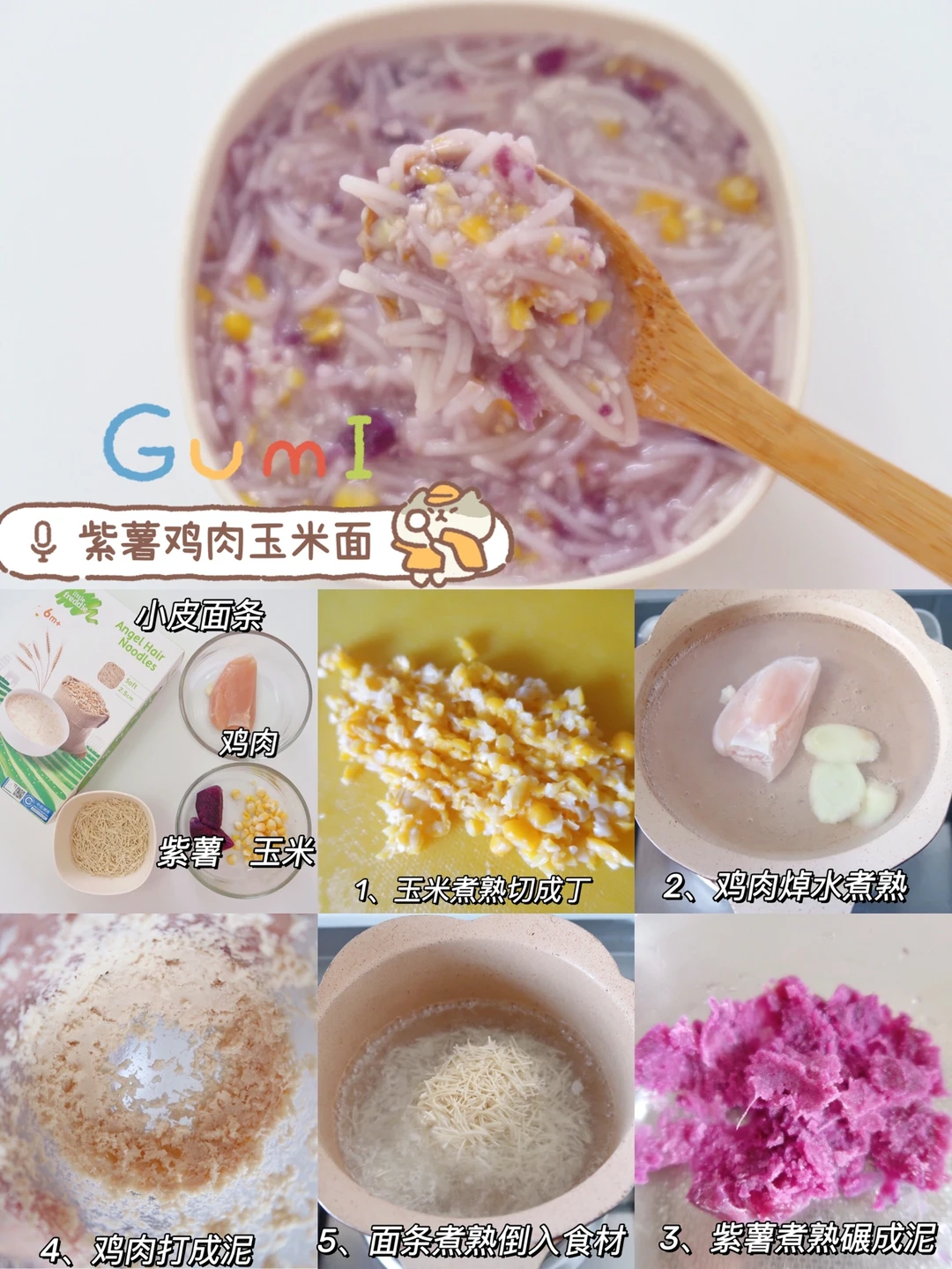 制作过程:紫薯玉米蒸熟捣成泥,鸡肉焯水煮熟打成泥,面条煮熟后放入所有菜拌均即可