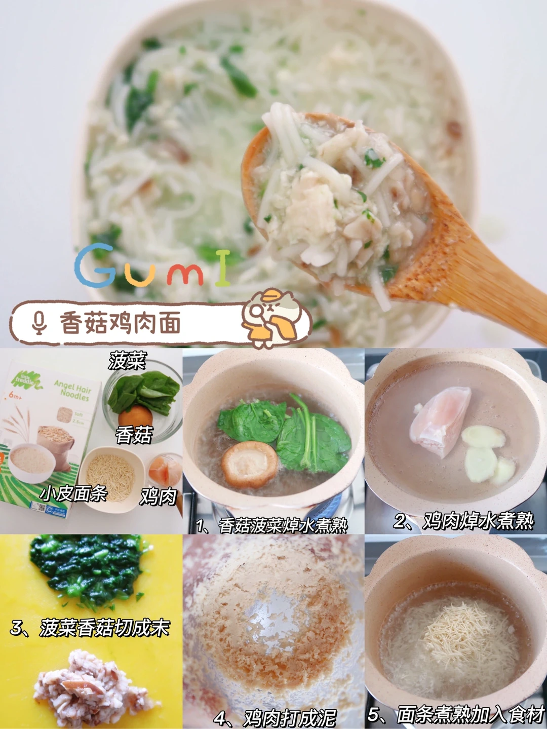 制作过程:香菇菠菜焯水切成末,鸡肉焯水煮熟打成泥,面条煮熟后放入所有菜拌均