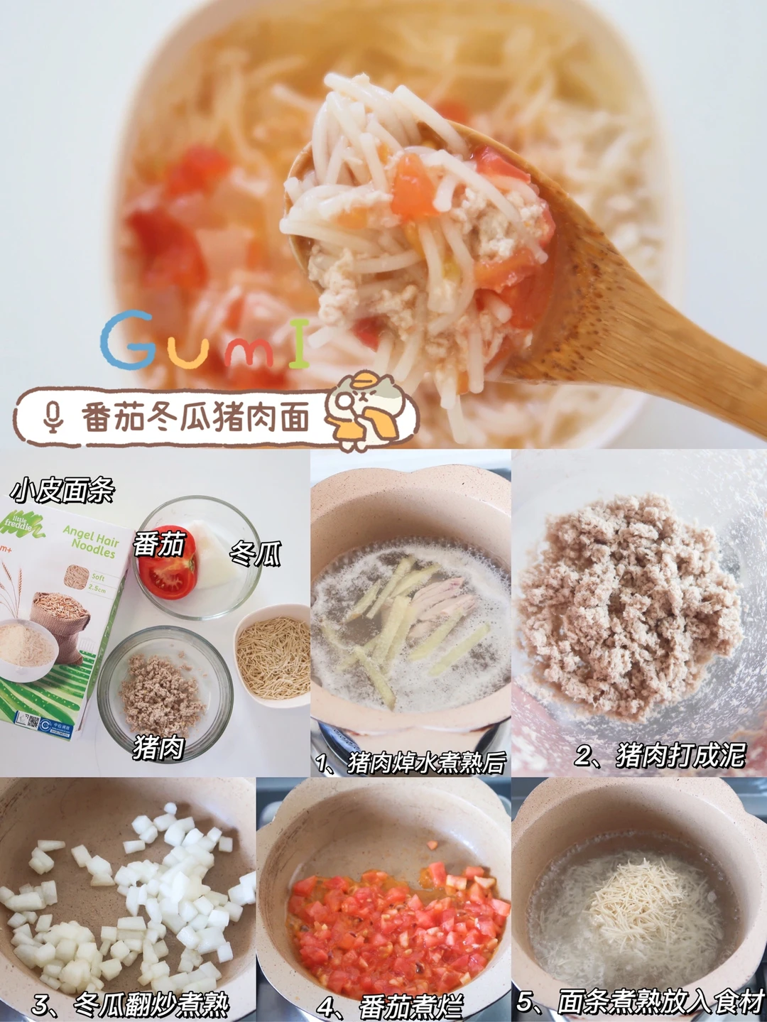 制作过程:番茄去皮煮烂,冬瓜切成丁煮熟捣成泥,猪肉焯水打成泥,面条煮熟放入所有菜拌均即可