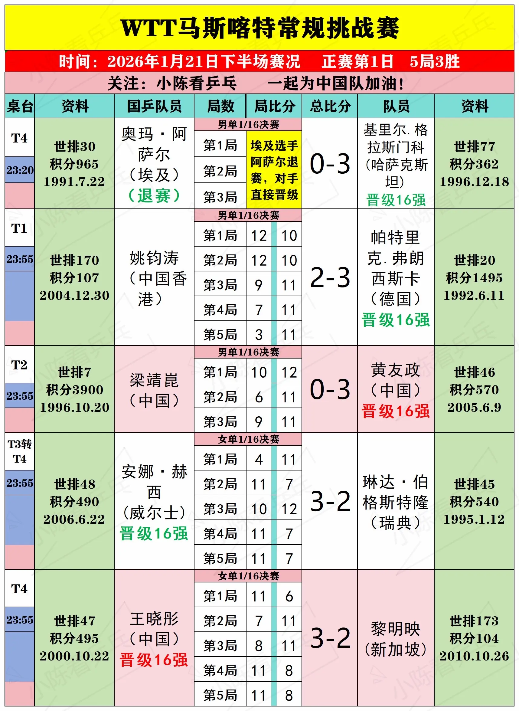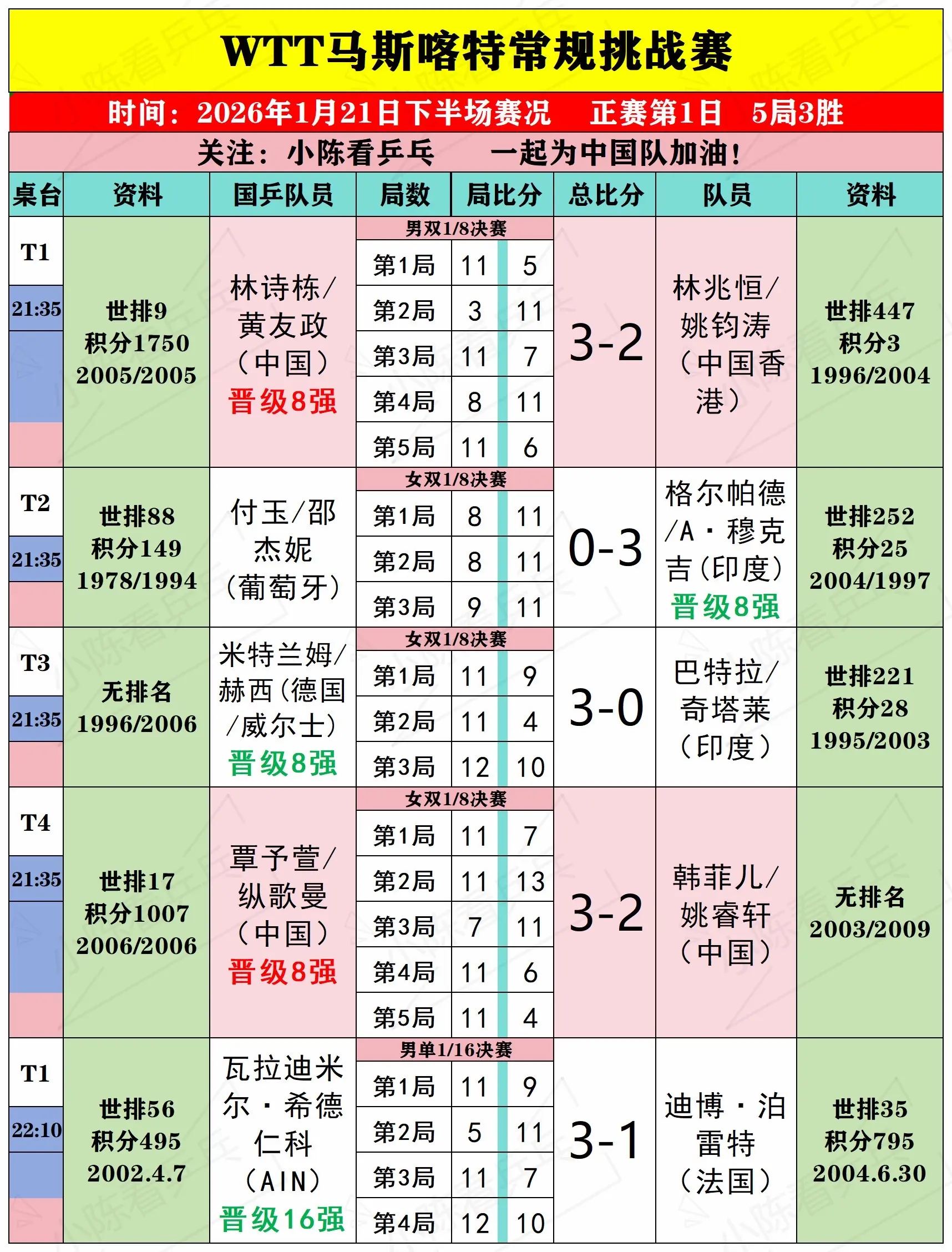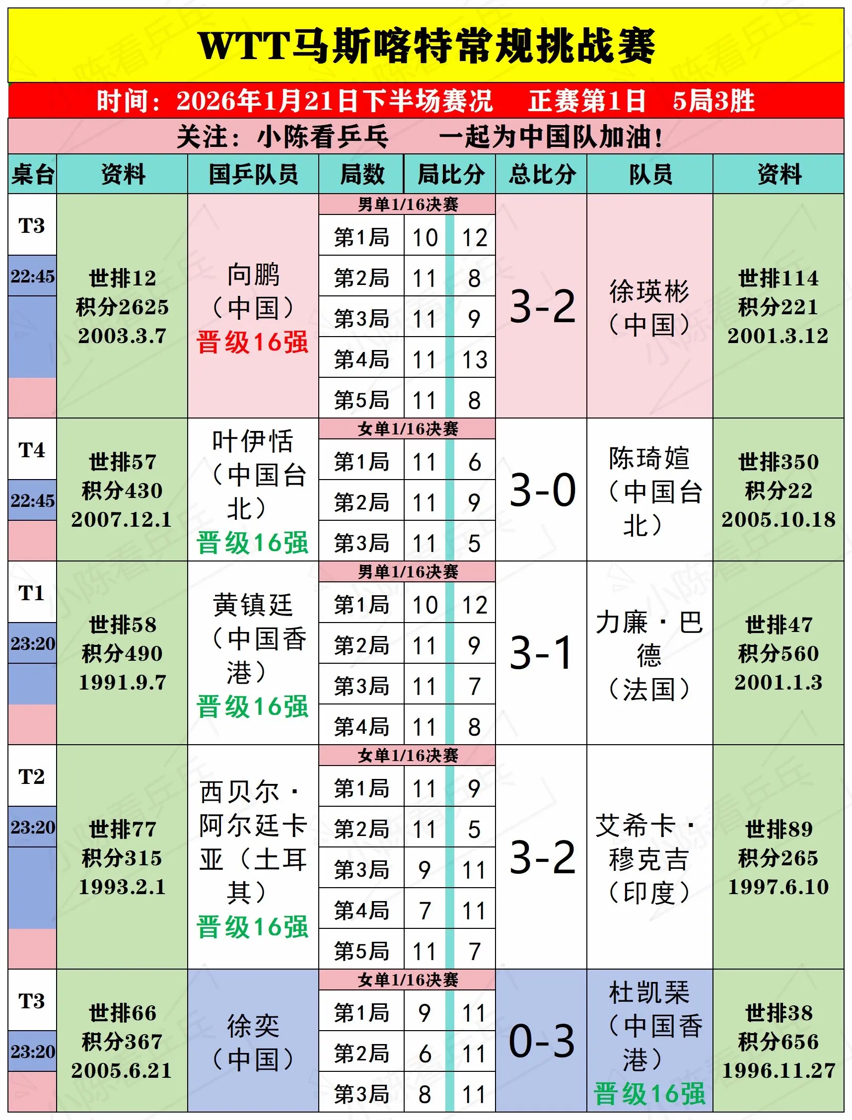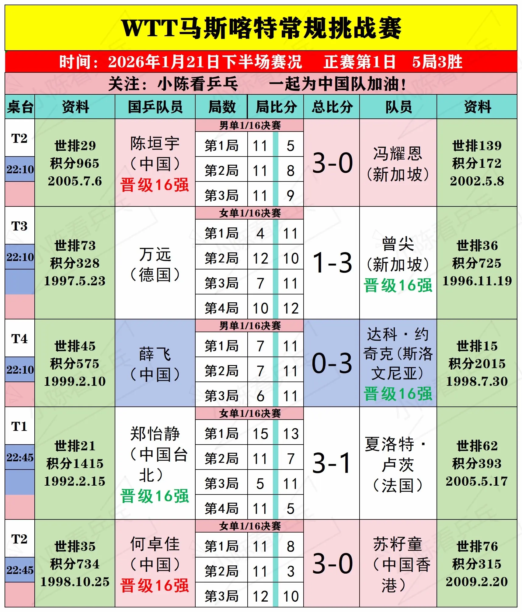 WTT马斯喀特常规挑战赛21日下半场赛况。WTT马斯喀特常规挑战赛1月21日下半场赛况,男女单打1/16决赛,双打1/8决赛,中国队继续加油。