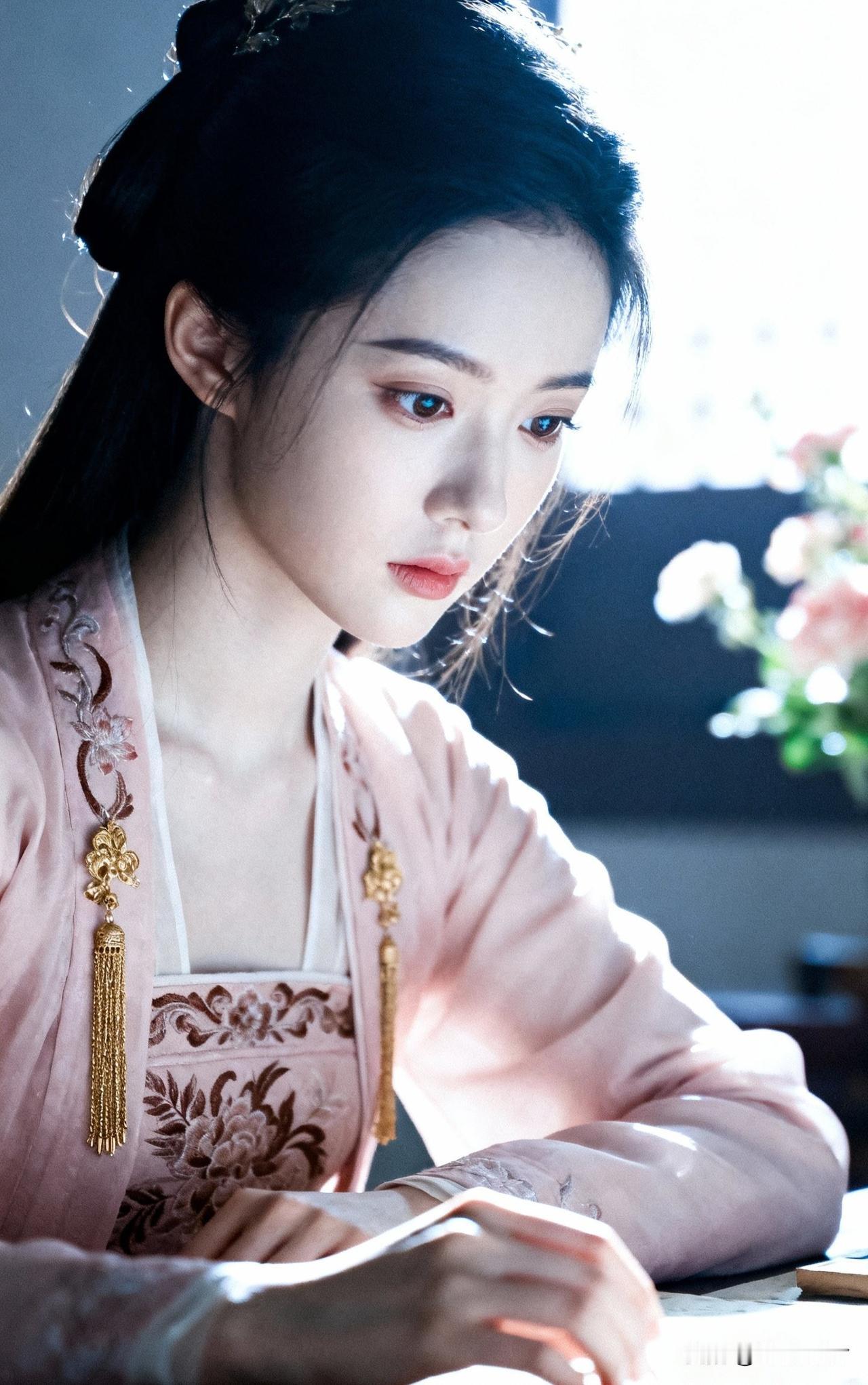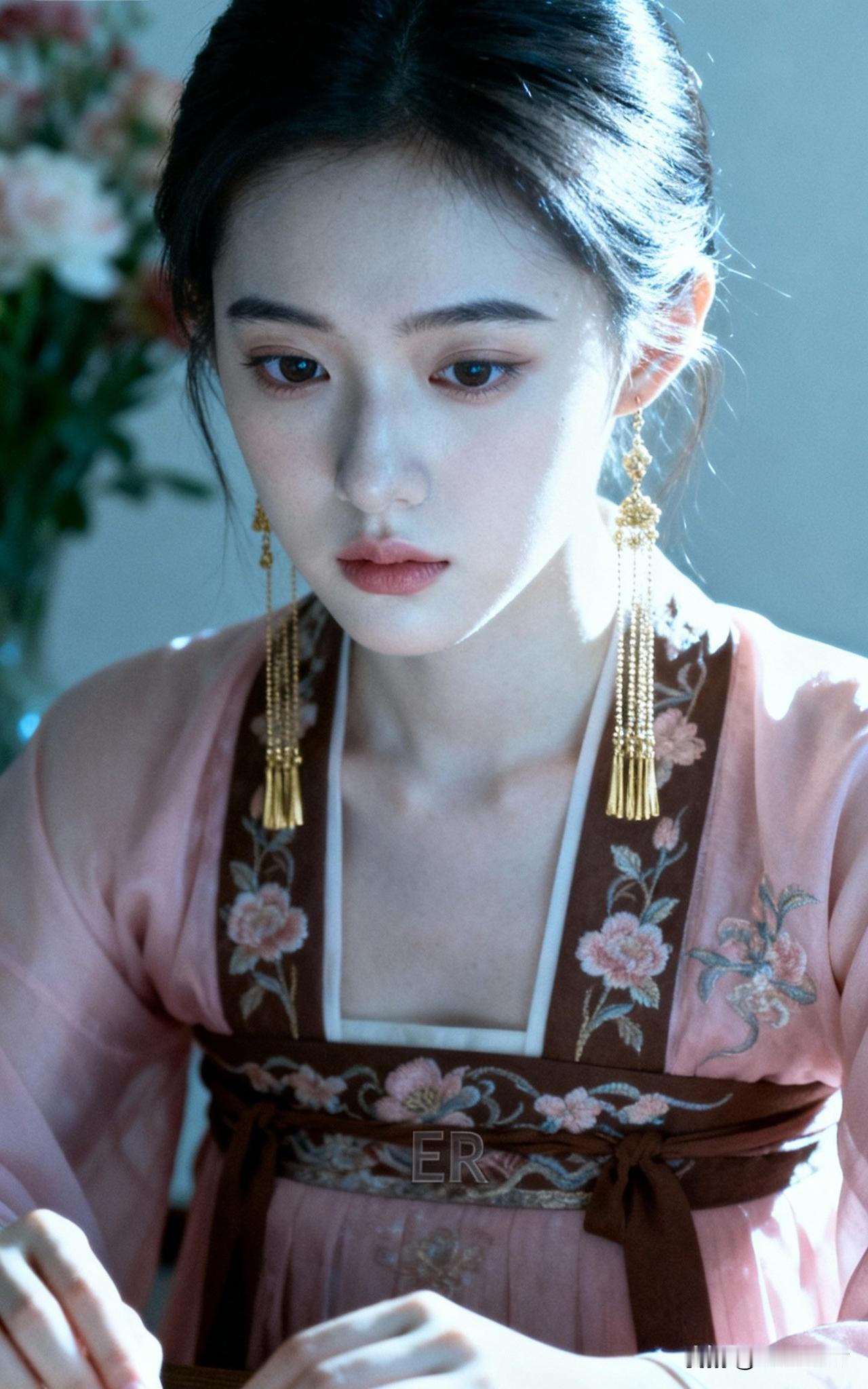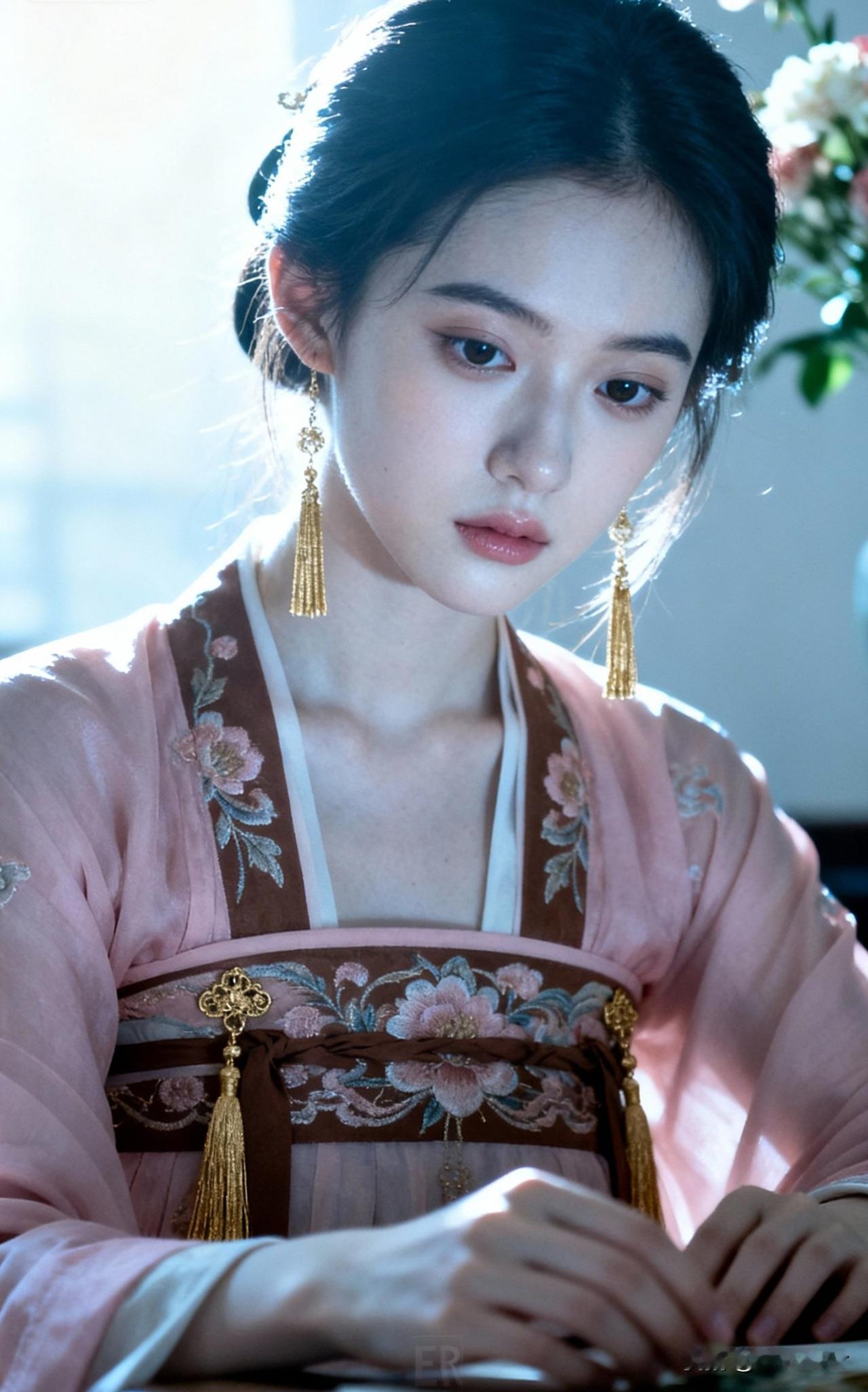 古风少女,花间仙子,粉嫩荷衣,木门背景,清新自然。
