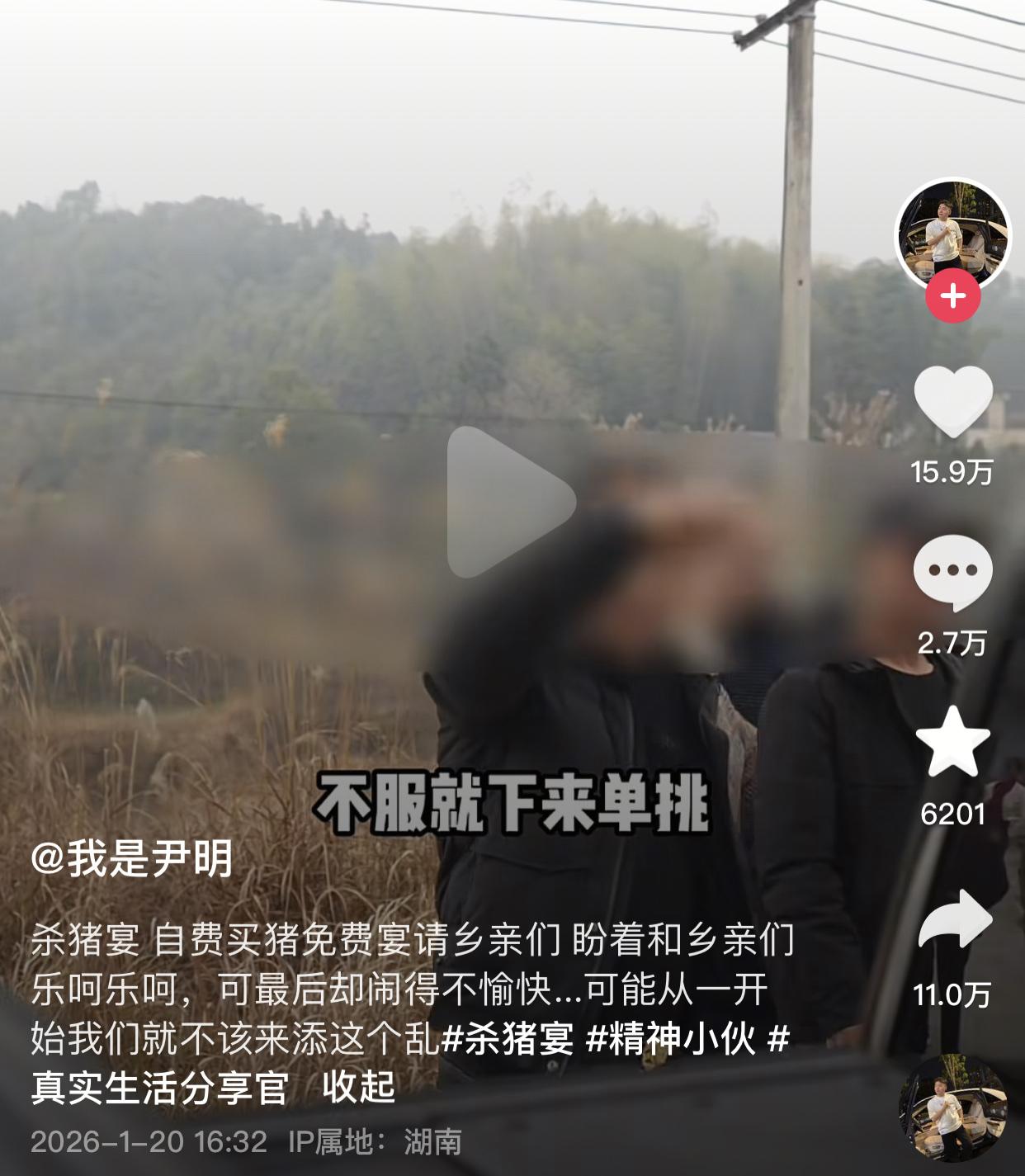 自费请株洲某村村民吃刨猪宴,结果宴没办成,猪肉被村民瓜分了,人也被堵了,不交场地费就走不了,株洲文旅忙活了一年全白干了。 起因是博主尹明自费3240元买了一头年猪,计划在株洲某村办刨猪宴请村里的孤寡老人吃一顿。因为用了当地一家村民的场地,为此博主还特意切了一大块猪肉给主人家,前期沟通对方也没有异议。 结果等博主把猪肉切好了,配菜备好了,锅也架上,就等着烧柴炒菜开席时,主家突然变脸,以“柴火、水电有成本”为由要求博主给他2000元场地费,还把车开到路中间不让他们离开,并且说她不稀罕博主的猪肉,因为猪肉不值钱。 博主对此很生气,于是双方争执了几句,结果村里的其他人见状都走了过来围住了博主一行人。博主为了息事宁人,给他们转了1200元的场地费,还不断给这家人道歉,他们才让博主离开。最终不仅刨猪宴没办成,切好的猪肉也被当地村民拿走。临走时主家还对着博主说了一句:“不服就下来单挑”。