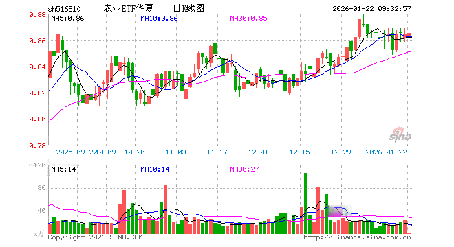 1月22日,农业ETF华夏(516810)开盘跌0.12%,报0.863元。农业ETF华夏(516810)重仓股方面,牧原股份开盘跌0.09%,温氏股份涨0.13%,海大集团跌0.02%,藏格矿业跌0.01%,盐湖股份涨0.89%,新希望涨0.11%,亚钾国际涨0.86%,梅花生物跌0.09%,扬农化工涨0.47%,大北农涨0.00%。