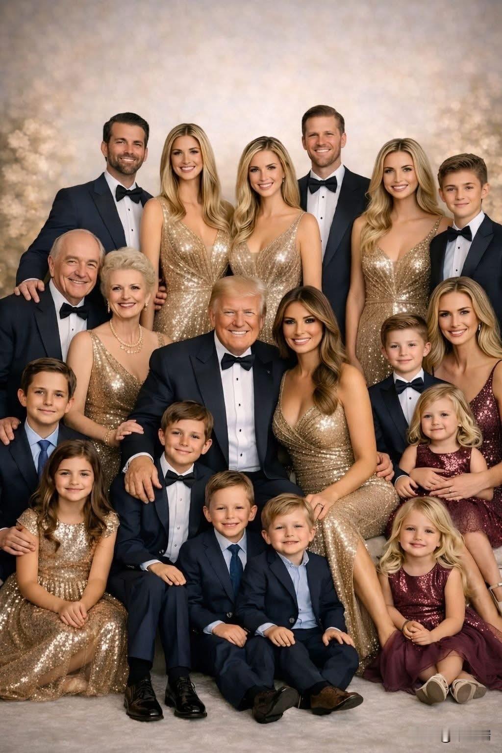 这是一张特朗普家族在 2023年圣诞节 期间拍摄的家庭合影。这张照片是在海湖庄园 (Mar-a-Lago) 拍摄的。 照片中的人物和相关信息如下: 前总统唐纳德·特朗普 (Donald Trump) 位于照片中心。 伊万卡·特朗普 (Ivanka Trump) (特朗普的大女儿) 站在她父亲的左后方。她的丈夫 贾里德·库什纳 (Jared Kushner) 站在伊万卡后面。 伊万卡和贾里德的三个孩子 (特朗普的孙辈) 也在: 阿拉贝拉·库什纳 (Arabella Kushner) 站在最左边,穿着金色礼服。 约瑟夫·库什纳 (Joseph Kushner) 和 西奥多·库什纳 (Theodore Kushner) (两个小男孩) 坐在前景。 小唐纳德·特朗普 (Donald Trump Jr.) (特朗普的大儿子) 站在照片左上方。 金伯利·吉尔福伊尔 (Kimberly Guilfoyle) (小唐纳德·特朗普的未婚妻) 站在小唐纳德旁边。 小唐纳德和前妻的几个孩子也在照片中。 蒂芙尼·特朗普 (Tiffany Trump) (特朗普的小女儿) 站在照片右上方,穿着金色礼服。 迈克尔·布洛斯 (Michael Boulos) (蒂芙尼的丈夫) 站在蒂芙尼旁边。 巴伦·特朗普 (Barron Trump) (特朗普最小的儿子) 站在最右后方,身高非常突出。 梅拉尼娅·特朗普的父亲 维克托·克纳夫斯 (Viktor Knavs) 也在照片中。 梅拉尼娅·特朗普 (Melania Trump) 和 埃里克·特朗普 (Eric Trump) 没有出现在这张合影中。