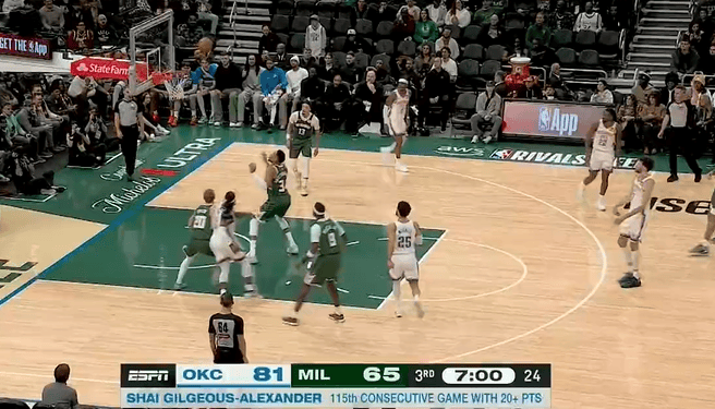 比赛第三节,亚历山大本场已得21分,跨赛季连续第115场比赛砍下20+。