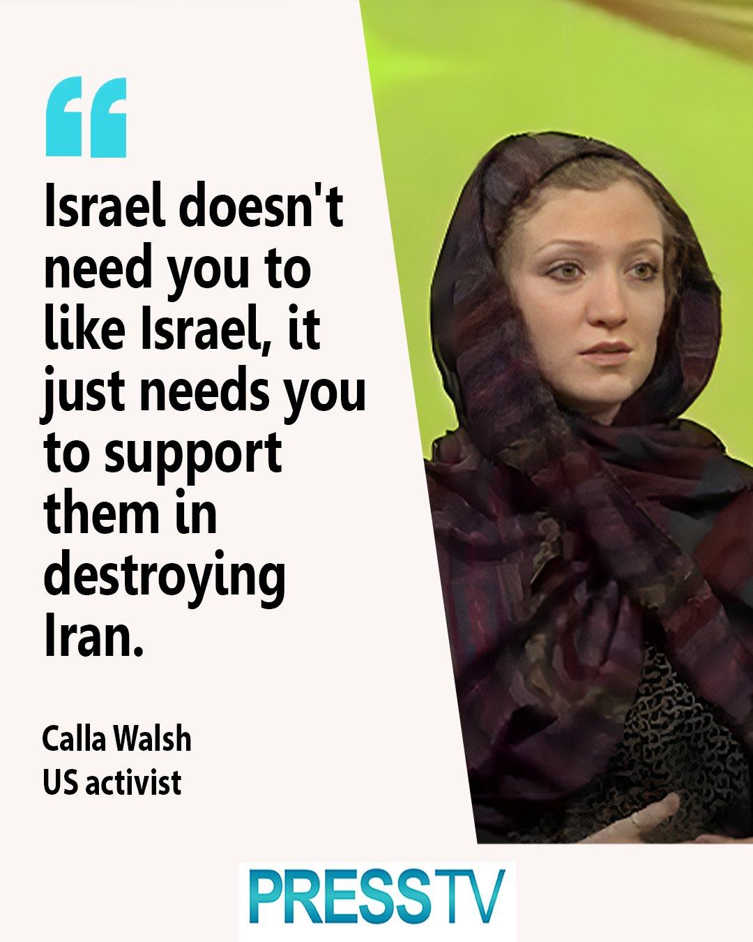 新闻快讯——以色列不需要你喜欢它,只需要你支持它摧毁伊朗。 ——卡拉·沃尔什(美国活动人士) 消息来源伊朗电视台