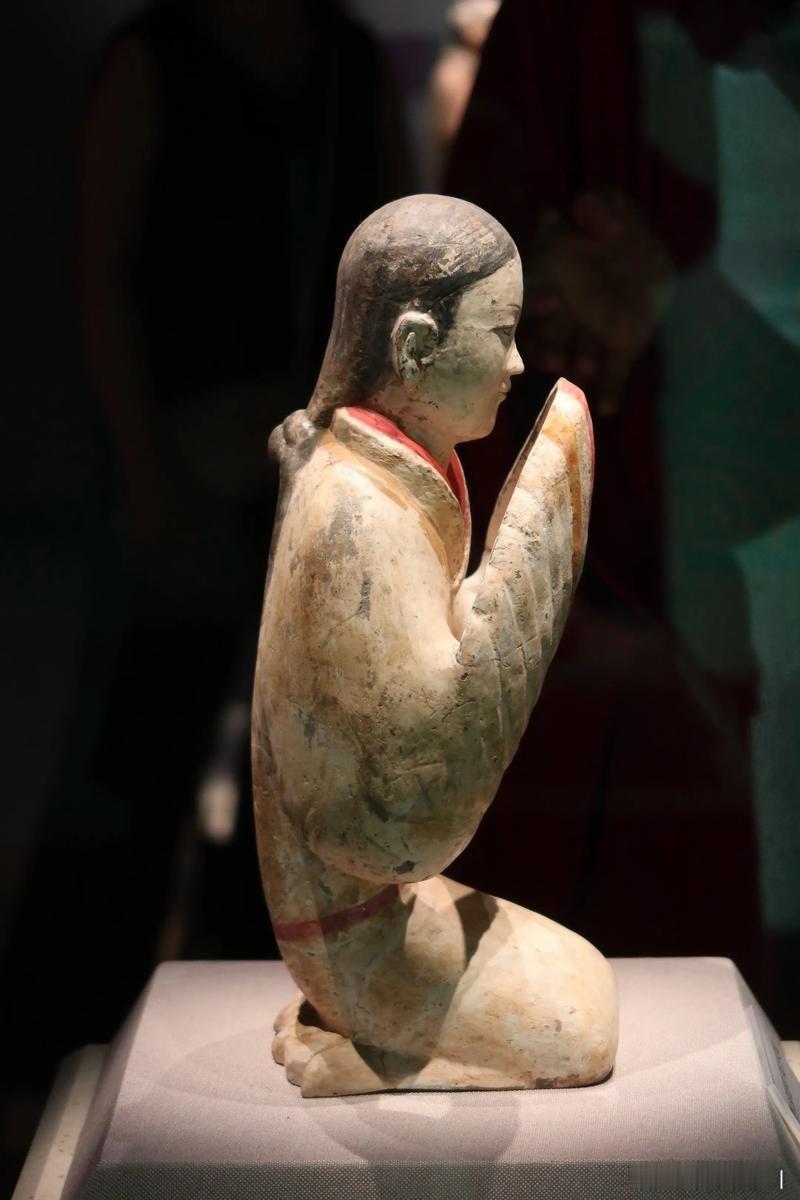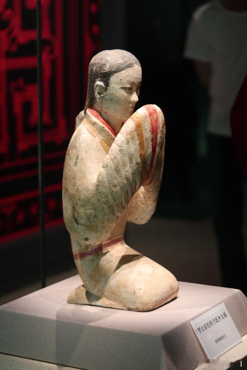 中国最初的微笑汉景帝陪葬墓出土的跽坐陶俑,特别是其中的塑衣式彩绘拱手跽坐女俑,是