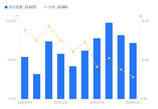 日期A股户数(户)流通A股户均持股数(股)户均持股市值(万元)2026-01-2010600021081.7722.522026-01-1011100020132.1422.692025-12-3111900018778.7222.852025-12-1910900020501.5323.522025-12-1010100022124.7729.652025-11-289100024555.9231.092025-11-209900022570.6430.542025-11-1010700020883.1230.492025-10-318600025982.4835.102025-10-209700023036.0232.94