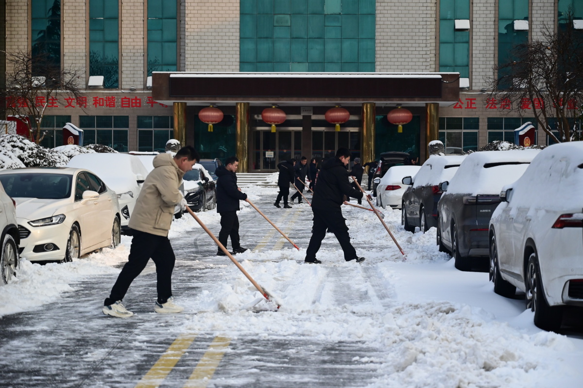 在城区,息县法院组织干警在寒风中集结,他们手持铁锹、扫帚相互配合,有的用铁锹奋力破除路面坚冰,有的推着小车将积雪运送指定位置,仅用一个半小时便打通诉讼服务中心、办公楼前主干道,随后转战分包路段持续奋战,以“平安路”“暖心路”践行司法为民初心。息县自然资源局闻令而动,以雪为令,第一时间组织全体干部职工奔赴分包路段,全力开展清雪除冰工作,党员干部冲锋在前,按照“先主后次、分段推进”的方法,默契配合、全力清除道路积雪与暗冰。与此同时,局属各二级机构以及各乡镇(街道)自然资源所的同志们也积极响应号召,迅速组织力量,对各自办公区域周边及所在辖区主要道路、出入口的积雪进行及时清扫。从局机关大院到基层所站,清雪行动同步展开,形成了上下联动、全员参与的良好局面。经过数小时连续奋战,不仅分包责任路段的积雪积冰被彻底清理,全局各办公点周边道路也恢复了整洁畅通,共同为群众出行构筑起一道坚实可靠的“安全线”。息县城市管理局更是迅速响应、精准发力,聚焦沿街商户占道搭建的移动帆布篷安全隐患,开展专项排查整治行动,以硬核举措守护城市安全与市民出行畅通。共排查累计走访沿街商户137家,排查出存在安全隐患的占道移动帆布篷36处,清理废弃帆布、锈蚀支架等杂物57余件,并加强24小时巡查值守,筑牢城市安全屏障。