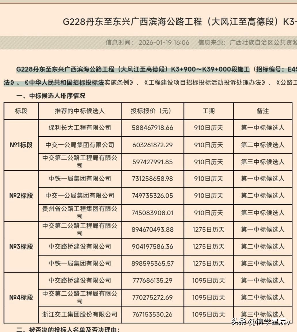 中国沿海公路广西段仅北海段未开通,也就是连接钦州与北海合浦西场的“钦北通”一一大风江大桥的东端为起点,至北海高德镇。 据1月19日广西公共资源交易中心公告,建设招标落锤。项目名称G228丹东至东兴广西滨海公路工程(大风江至高德段)K3+900~K39+000段。 总投资43.5亿元,路线长36.6公里,其中特大桥南流江支汊2、3特大桥。 施工分为四个标段,一至四标第一中候选人分别是:保利长大工程有限公司、中铁一局集团有限公司、中交第二公路工程局有限公司、中交路桥建设有限公司 。工期根据不同标段为30-42个月。 业主为北海市路港建设投资开发有限公司,建设资金除上级补助资金外,剩余由北海市政府性基金预算逐年安排解决,项目出资比例为上级补助资金75%,北海市政府性基金预算资金25%”,来源为80%概算建安费的超长期国债+6亿元自治区补助+市财政资金)。