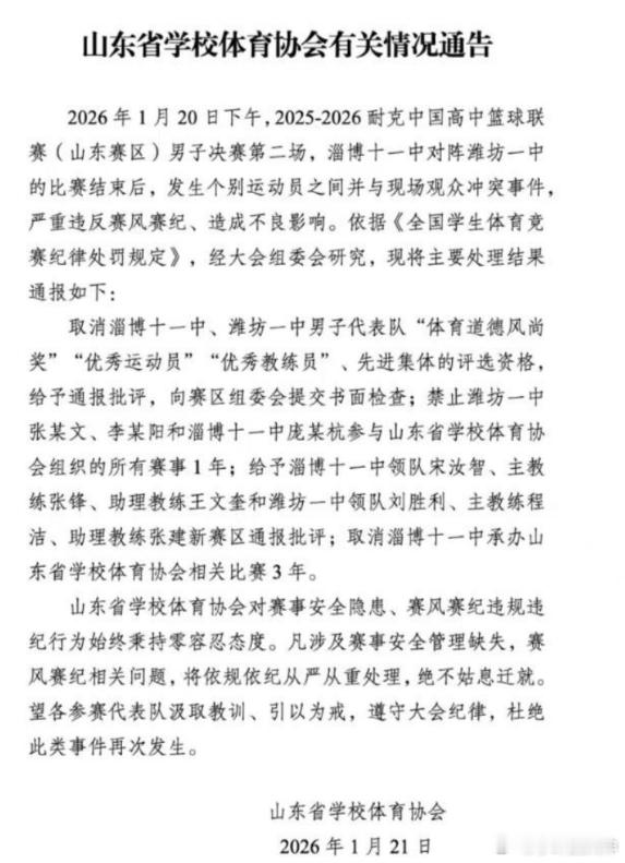 新华社转发耐高打架事件处罚结果:3名打架球员被禁赛一年1月22日讯 在此前举行的耐高山东区淄博十一中对阵潍坊一中的比赛中,赛后有球员与场边球迷发生口角,随后演变成大规模冲突,大批球员和观众进场互殴。新华社今日转发了此次耐高打架事件的处罚结果,原文如下:记者22日从山东省学校体育协会获悉,针对20日在2025-2026耐克中国高中篮球联赛基层赛(山东赛区)男子决赛第二场淄博十一中队和潍坊一中队赛后发生的冲突事件,依据《全国学生体育竞赛纪律处罚规定》,大会组委会研究后,作出对部分球员禁赛、取消淄博十一中的比赛承办资格等处罚决定。山东省学校体育协会公布的情况通告称,取消淄博十一中、潍坊一中男子代表队“体育道德风尚奖”“优秀运动员”“优秀教练员”、先进集体的评选资格,给予通报批评,向赛区组委会提交书面检查;禁止潍坊一中张某文、李某阳和淄博十一中庞某杭参与山东省学校体育协会组织的所有赛事1年;给予淄博十一中领队宋汝智、主教练张锋、助理教练王文奎和潍坊一中领队刘胜利、主教练程洁、助理教练张建新赛区通报批评;取消淄博十一中承办山东省学校体育协会相关比赛3年。中国高中篮球联赛由中国学生体育联合会和中国篮球协会共同主办,是目前国内关注度最高的高中篮球赛事之一,分为基层赛、分区赛、总决赛等阶段。中国篮球