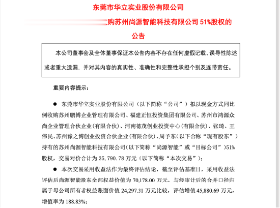 第一次跨界发生在2024年9月。彼时,华立股份公告拟以3.58亿元收购苏州尚源智能51%股权,业务方向由装饰复合材料延伸至智能装备领域。该交易披露后不久,因标的公司经营活动现金流持续为负、估值增值率偏高等问题,华立股份即收到上交所监管工作函。但该笔交易依旧与2024年11月完成工商变更登记。