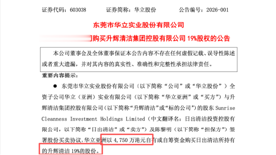 从交易形式看,这并非一笔需要提交股东大会审议的重大资产重组。1月16日,华立股份披露拟以0.128港元每股的价格,受让升辉清洁19%股权,总对价为4750万港元。交易完成后,公司将成为升辉清洁第二大股东。华立股份在公告中称,本次参股系战略投资,旨在在国际化、智能化及市场化层面与标的形成协同。