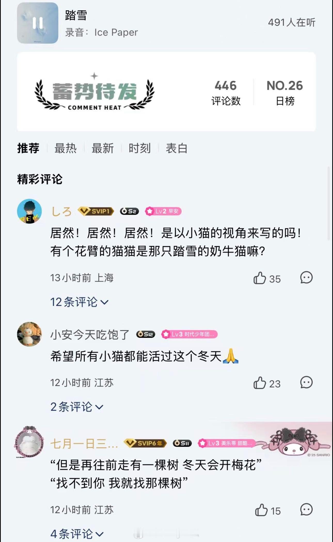 原来早安的新歌是写给流浪猫的今天零点早安新歌《踏雪》上线,听前奏就觉得是一首好温柔像雪花飘落的细腻感。没想到听着听着居然有刀啊呜呜呜呜,原来这首歌是以小猫的视角写的!本身早安就养了好多只猫咪,太共情了…说好一起走怎么最后却找不见你了“他们说看到你唠 身上盖了块布”这句我真的哭亖,他们在另一个平行时空终会再见面的对吗