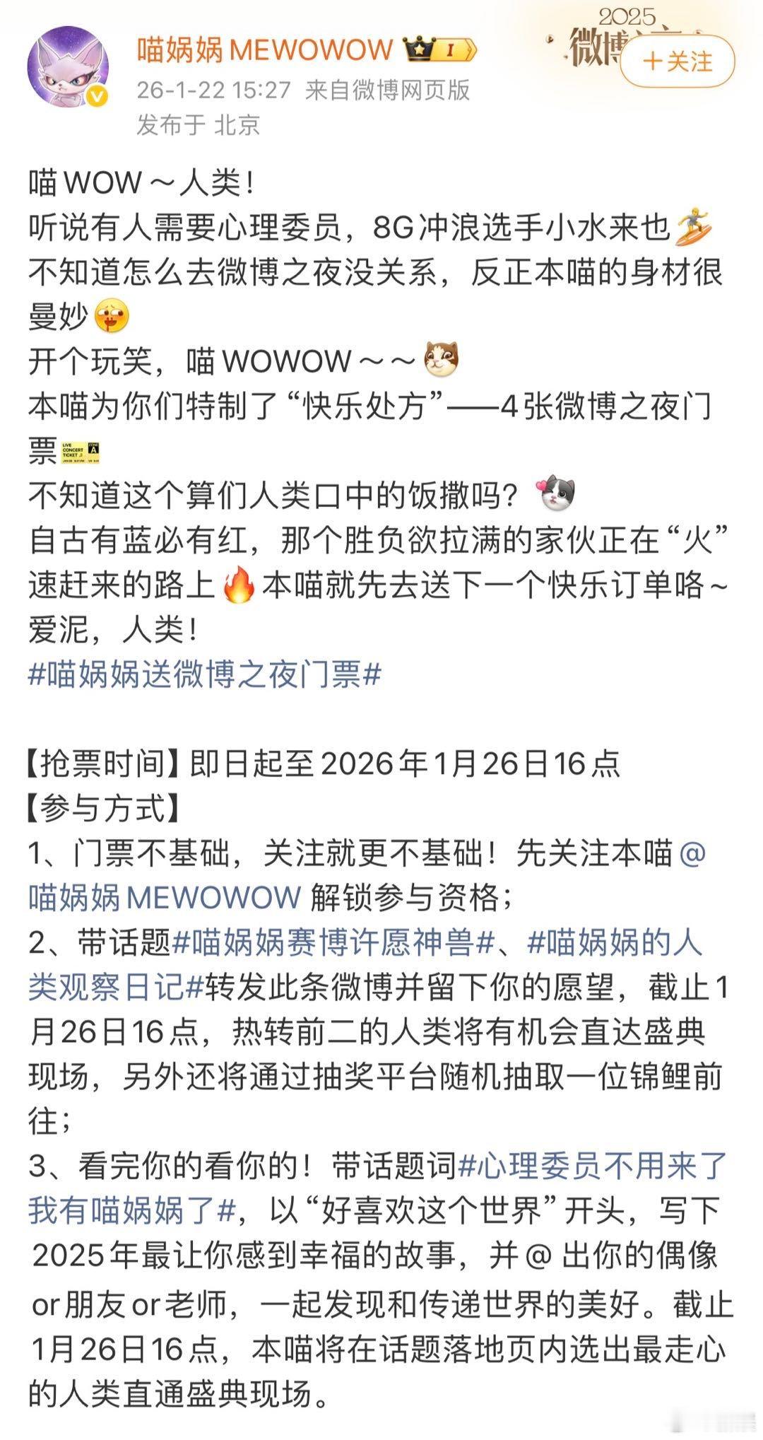 喵娲娲 微博之夜承办商 什么?喵娲娲带着4张微博之夜门票闪现了!听说人类需要“快乐处方”?我们喵娲娲表示门票绝对是有的!4张直通微博之夜的门票等你来拿~这只大方咪就这样豪横,完全微博之夜承办商的程度了!这只喵娲娲已开启快乐订单配送模式~快来转发抽取吧,说不定那个幸运的人类就是你!