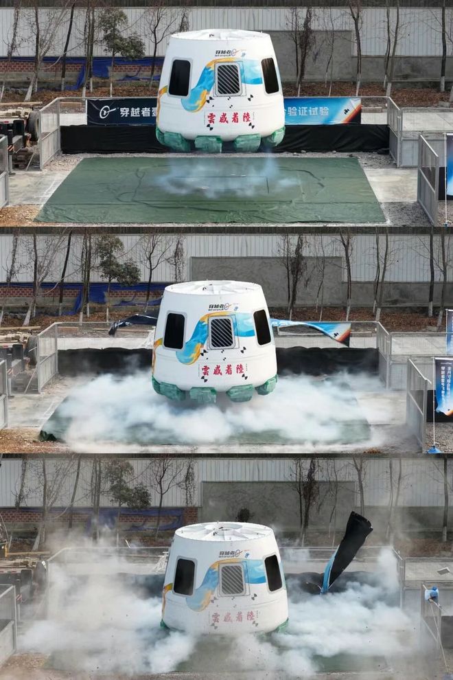 穿越者壹号(CYZ1)载人飞船全尺寸试验舱着陆缓冲综合验证试验现场