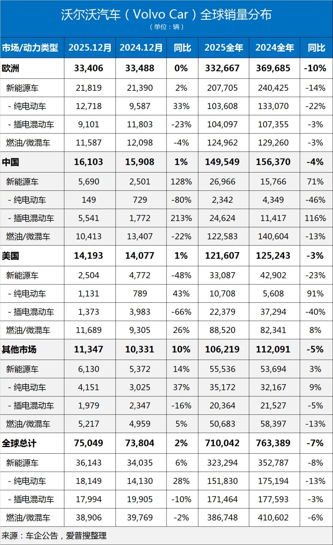 沃尔沃汽车2025年销量710,042辆,同比下降7%,其中,新能源车销量323,294辆,同比下降8%,新能源渗透率46%。在中国,沃尔沃电动化转型步伐加快,虽然其在中国汽车总销量同比下降4%至149,549辆,但在中国新能源车销量同比大涨71%至26,966辆。