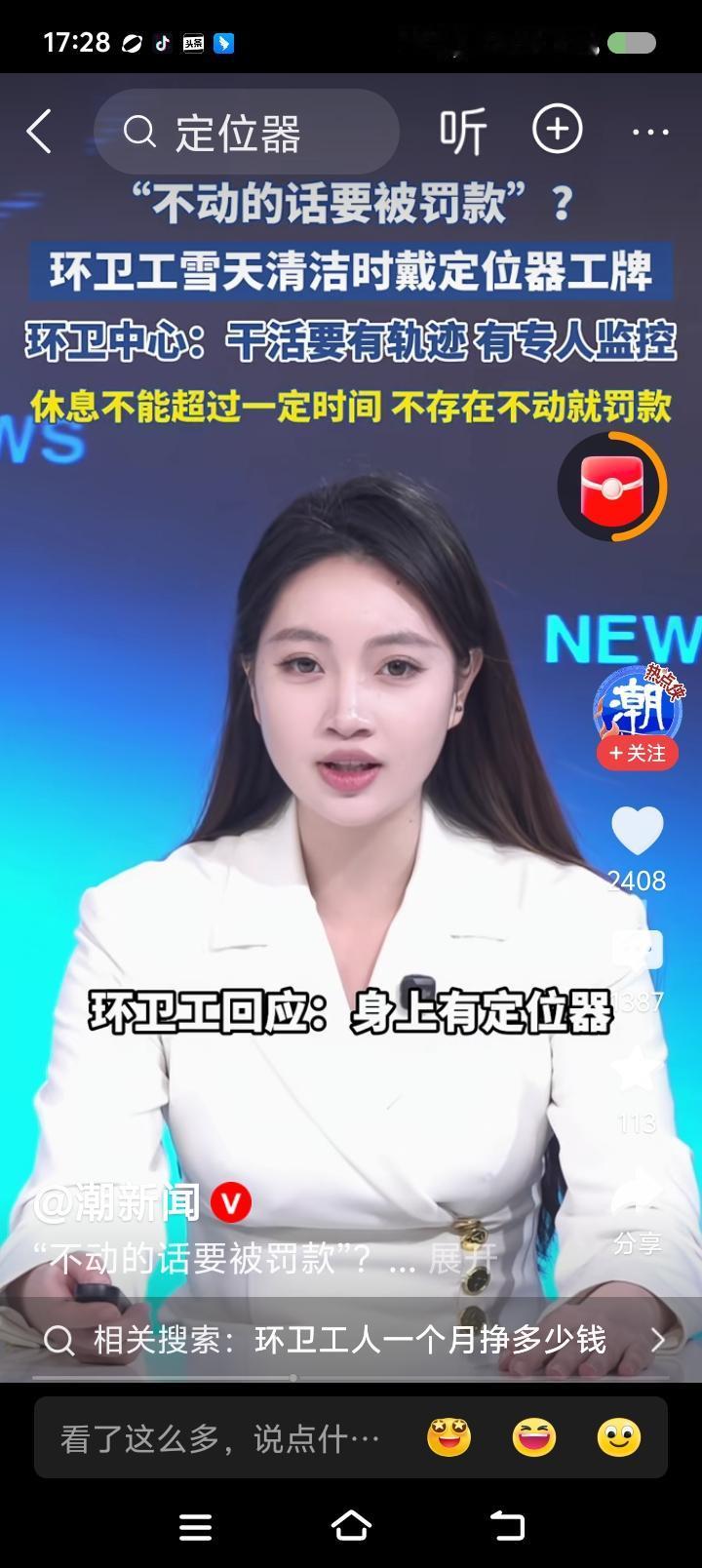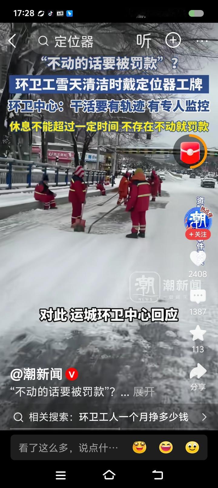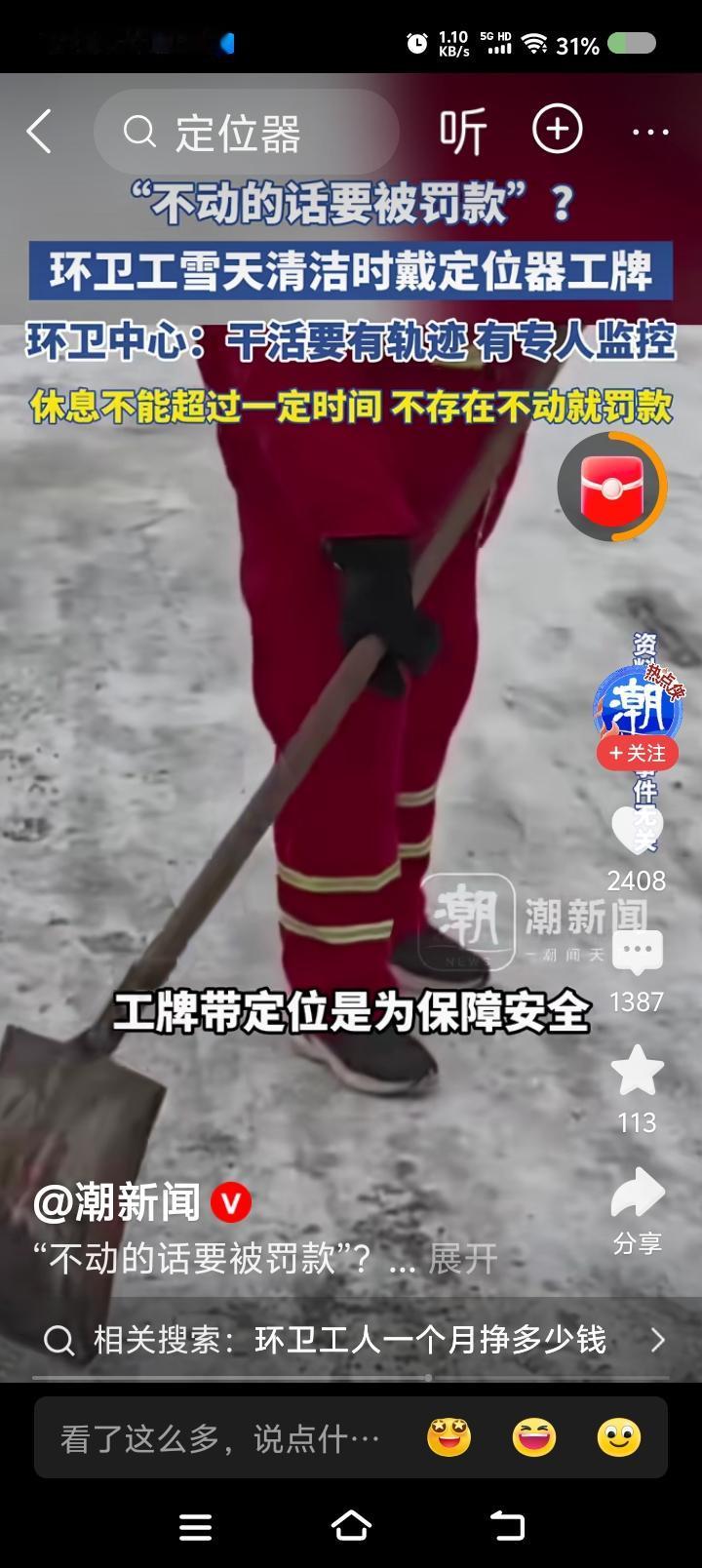 环卫中心,你何以服众?—— 据报道,山西某地环卫工人雪天作业,被路人问“不休息吗”,工人回应:“身上有定位器,不动就罚款。”环卫中心回应:“戴定位器是为了安全,休息有一定时间,干活要有轨迹,有专人监控,不存在不动就罚款。” 点评: 一、环卫工人是不是劳务公司派的?政府部门与劳务公司签合同?为什么政府部门不与劳动者直接签合同? 二、戴定位器合适么?扫雪还能丢了?雪有两米高?这是人,不是机器人,你监控啥?这是自由社会,你监控啥?干多少活什么标准多长时间干完,规定下发,你考核就行,有必要死规定人在干什么吗? 建议调查此事件!若管理违法违规,必须依法办理!若不够人性化,建议更改。