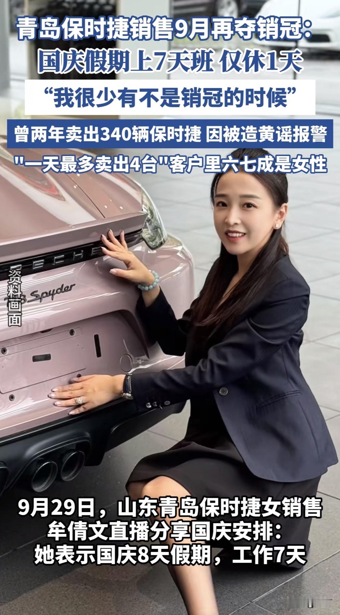 青岛保时捷销售牟倩文2025年9月又拿了销冠,当月交车23台,比第二名多8台,这是她今年连续第7个月夺冠,之前2023、2024年每年都卖170台。 她的成绩不是碰运气,手机24小时不关机,客户深夜问问题秒回,把车型参数背得滚瓜烂熟,还会做对比报告,老客户转介绍率特别高。 可火了之后麻烦也来,有人造黄谣,说她靠不正当手段卖车,还伪造不雅视频,浏览量几百万。她直接报警,用持续的好业绩回应质疑。 这事儿挺让人感慨,女性凭实力成功,却要被造谣。她的故事说明,真诚和专业才是立足根本,而网络谣言真该好好管管,不能让努力的人受委屈。