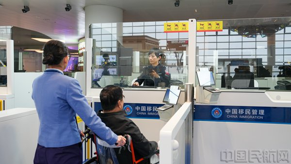 白云边检站移民管理警察使用新配备的可升降生物信息采集设备,为行动不便的旅客办理通关手续(本文图片均由广州白云出入境边防检查站)