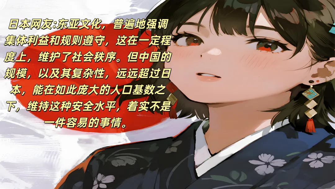 日本网友则从文化角度解读:“东亚文化,普遍地强调集体利益和规则遵守,这在一定程度上,维护了社会秩序。但中国的规模,以及其复杂性,远远超过日本,能在如此庞大的人口基数之下,维持这种安全水平,着实不是一件容易的事情。”