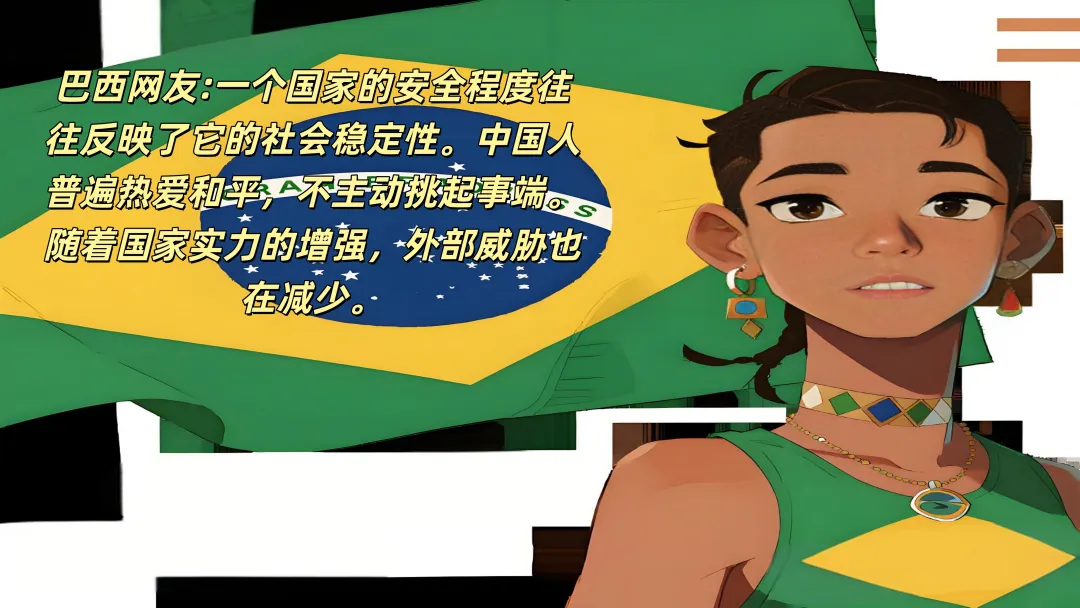 巴西网友从另一个角度分析:"一个国家的安全程度往往反映了它的社会稳定性。中国人普遍热爱和平,不主动挑起事端。随着国家实力的增强,外部威胁也在减少。"确实,中国在全球和平指数中排名第85位,而美国则排在第131位
