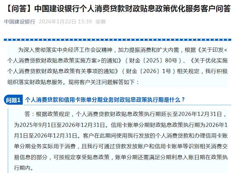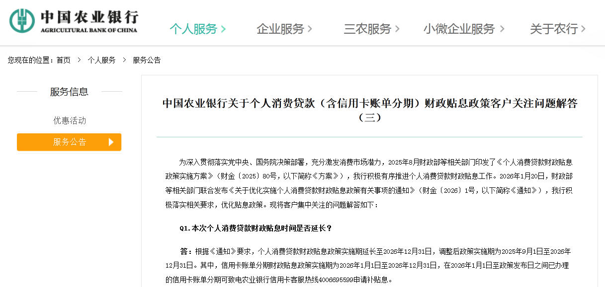 一是将个人消费贷款财政贴息政策实施期限延长至2026年12月31日。
