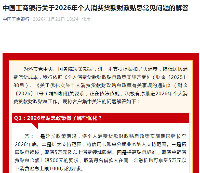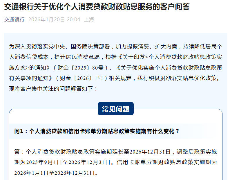 此外,多家银行表示,此前已签署个人消费贷款财政贴息服务协议的客户,自1月1日起自动适用最新贴息政策,无需重新签订协议。(中新经纬APP)