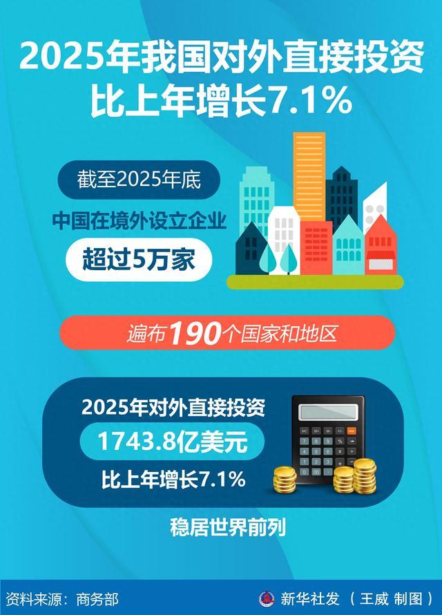 记者从商务部1月22日举行的例行新闻发布会上获悉,截至2025年底,中国在境外设立企业超过5万家,遍布190个国家和地区。对外投资存量连续9年保持世界前三。2025年对外直接投资1743.8亿美元,比上年增长7.1%,稳居世界前列。