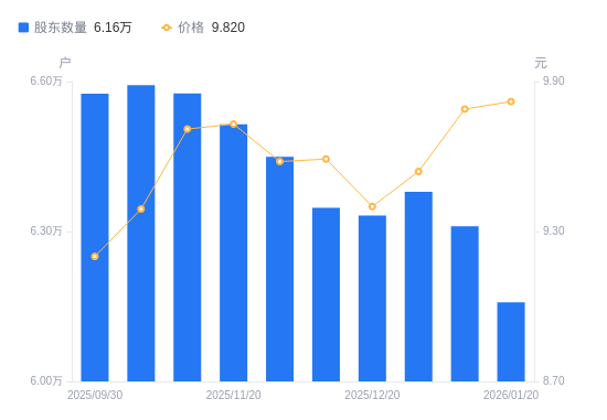 日期A股户数(户)流通A股户均持股数(股)户均持股市值(万元)2026-01-206158314289.6614.032026-01-106310413945.2313.652025-12-316379213794.8313.162025-12-206332113897.4413.062025-12-106347213864.3813.302025-11-306449513644.4713.072025-11-206514413508.5313.142025-11-106576413381.1812.992025-10-206592713348.1012.532025-09-306575813382.4012.31