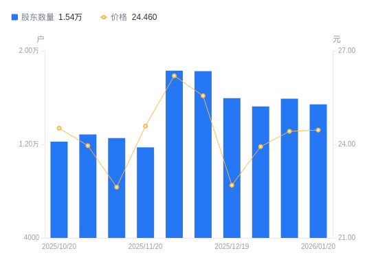 日期A股户数(户)流通A股户均持股数(股)户均持股市值(万元)2026-01-201542215066.6936.852026-01-091591414600.8835.662025-12-311524415242.6236.482025-12-191595614562.4533.042025-12-101826912718.7332.512025-11-281830212695.8033.262025-11-201175619765.1048.602025-11-101254618520.5241.912025-10-311285018082.3743.332025-10-201223118997.5046.58