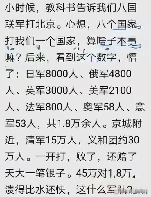 八国联军侵略过中国,我曾对他们恨之入骨!但看了这个数字,方知八国合起来,总共才1.8万兵力! 当时清军是多少?仅京城就有15万,还有30万义和团!本人奇怪的是,为何45万人,打不过1.8万侵略军?战败后还赔人家几亿两白银? 历史不能忘记,要知失败原因!融入世界求发展,合作共赢是方针。民主法治是保障,富民强国是根本!人民幸福国家强盛,谁能奈我何? …………
