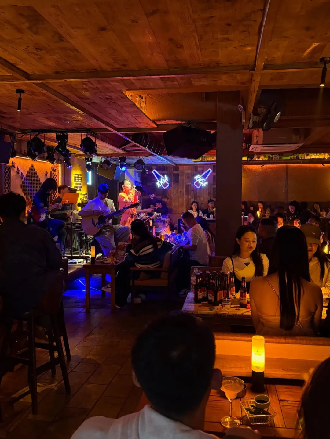 🎤驻唱:晚上7点半左右开始唱,小哥声音很干净,唱的都是耳熟能详的民谣和老歌,不吵不闹,就安安静静听歌喝酒,氛围感直接拉满!偶尔还会和台下互动两句,超亲切~
