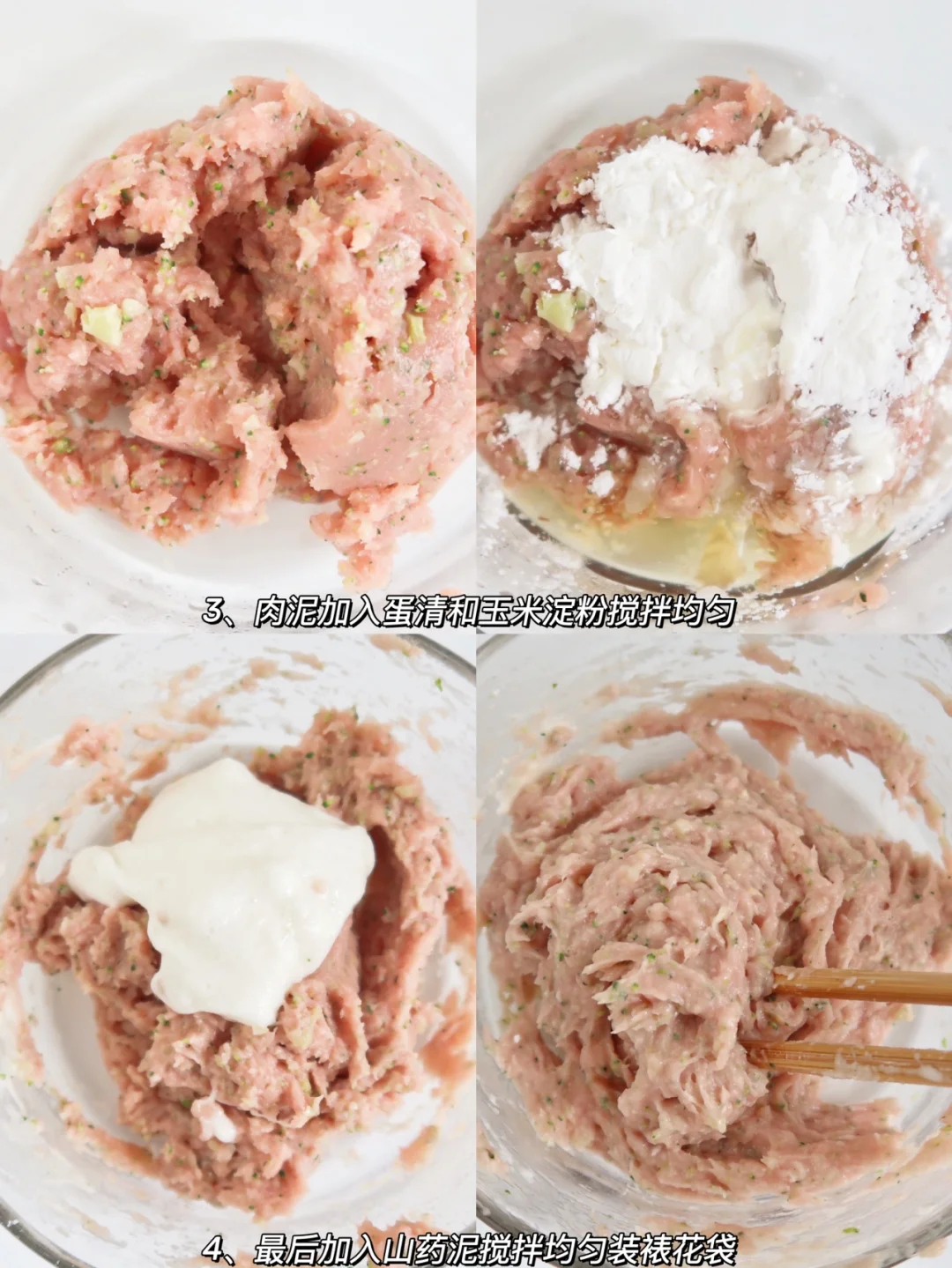 4、肉泥加入淀粉,蛋清和山药搅拌上劲