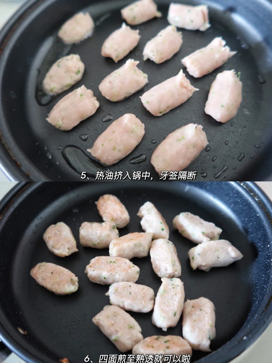 6、是平底不粘锅刷油,如图挤入肉泥,牙签隔断,小火煎至四面金黄熟透即可